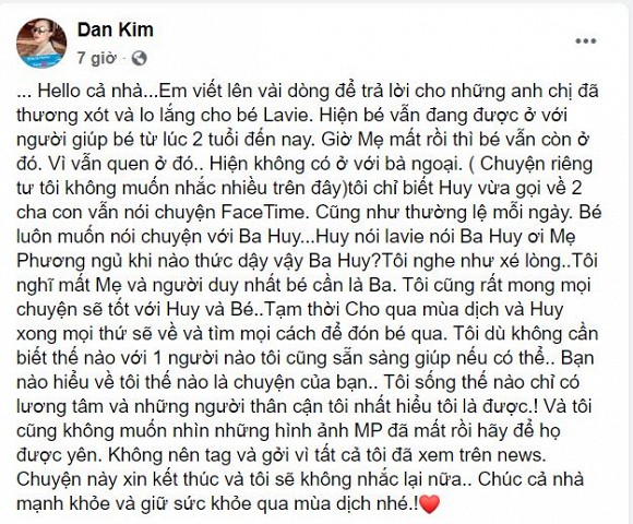 Chuyện riêng tư tôi không muốn nhắc nhiều trên đây. Tôi chỉ biết Huy vừa gọi về, hai cha con vẫn nói chuyện Facetime. Cũng như thường lệ mỗi ngày. Bé luôn muốn nói chuyện với ba Huy… Lavie hỏi: 'Ba Huy ơi, mẹ Phương ngủ khi nào thức dậy vậy ba Huy?'. Tôi nghe như xé lòng”, Đan Kim viết. Đoạn nói chuyện qua lại giữa nam diễn viên Phùng Ngọc Huy và con gái Lavie đã khiến Đan Kim không khỏi xót xa khi nghe câu hỏi ngây ngô mà Lavie dành cho ba.