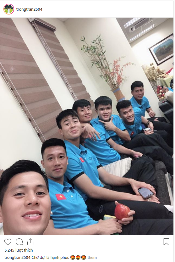 Trong đoạn clip, Trọng ỉn “ghen” ra mặt khi thấy Văn Đức gác chân thân thiết lên người Duy Mạnh. Anh thể hiện thái độ “bức xúc” của mình khi đăng tải đoạn clip cùng dòng chú thích “Giữa ban ngày sao” cùng 2 icon phẫn nộ. Trước đó, anh chàng cũng chụp “tự sướng” cùng các đồng đội ở phòng chờ sân bay Bacolod, kèm chú thích “Chờ đợi là hạnh phúc”. Câu chuyện của Đình Trọng đã khiến các fans sốt rần rần bởi vẻ “dễ thương vô số tội” của mình.