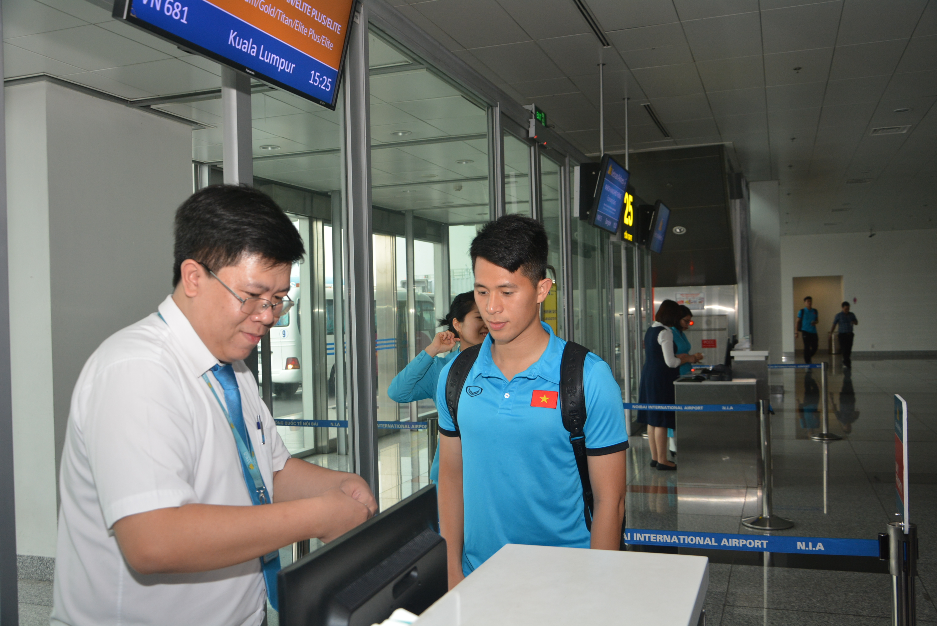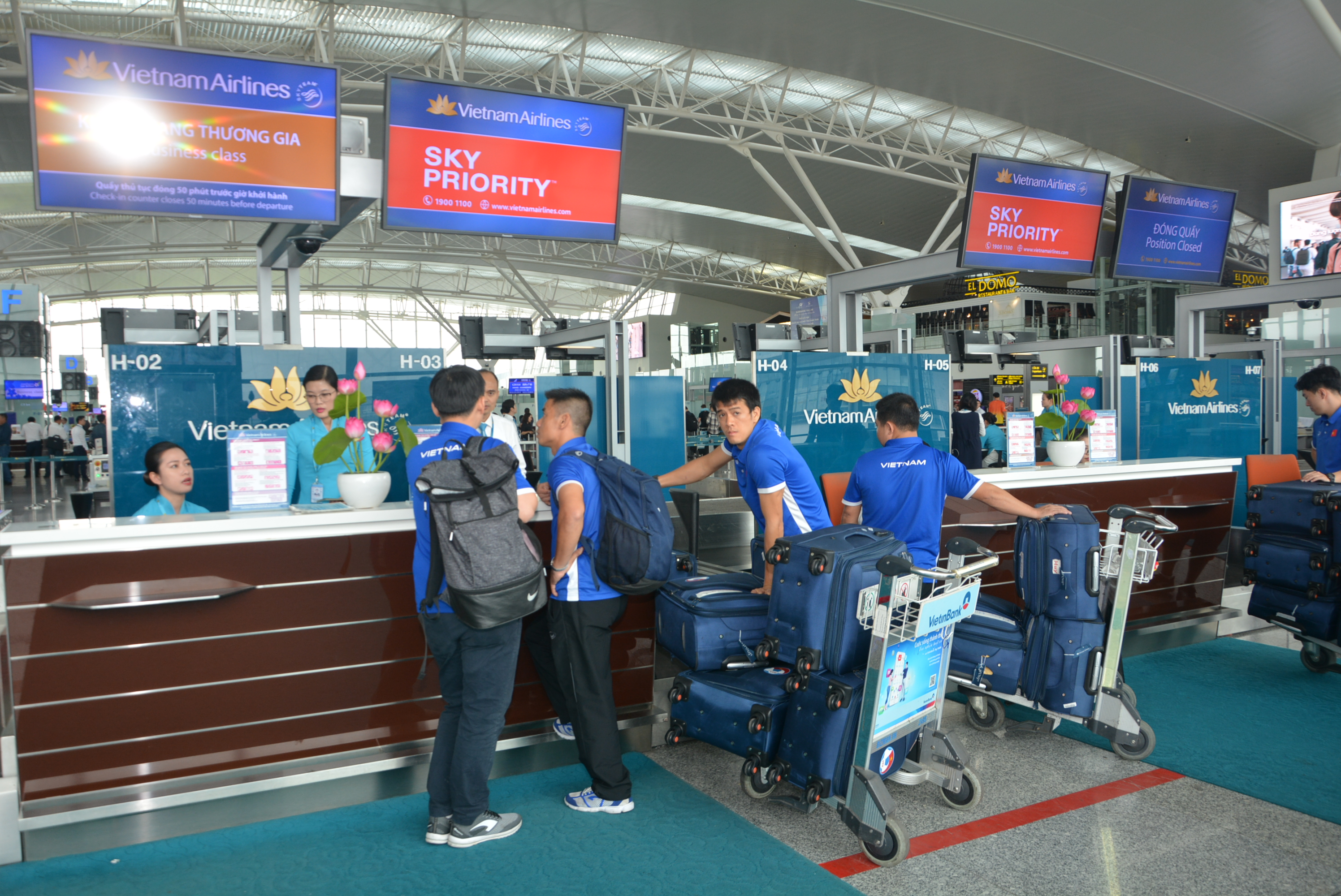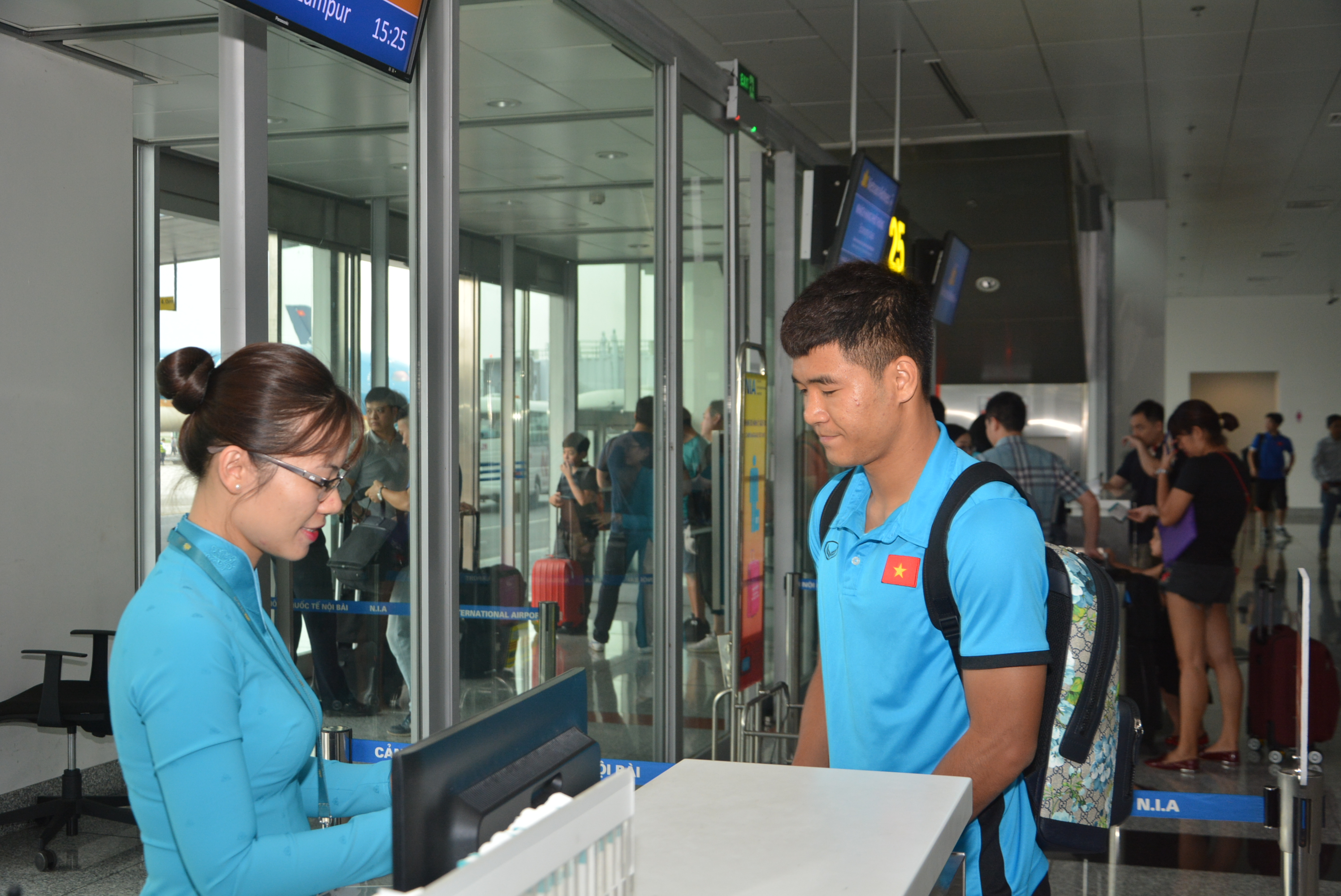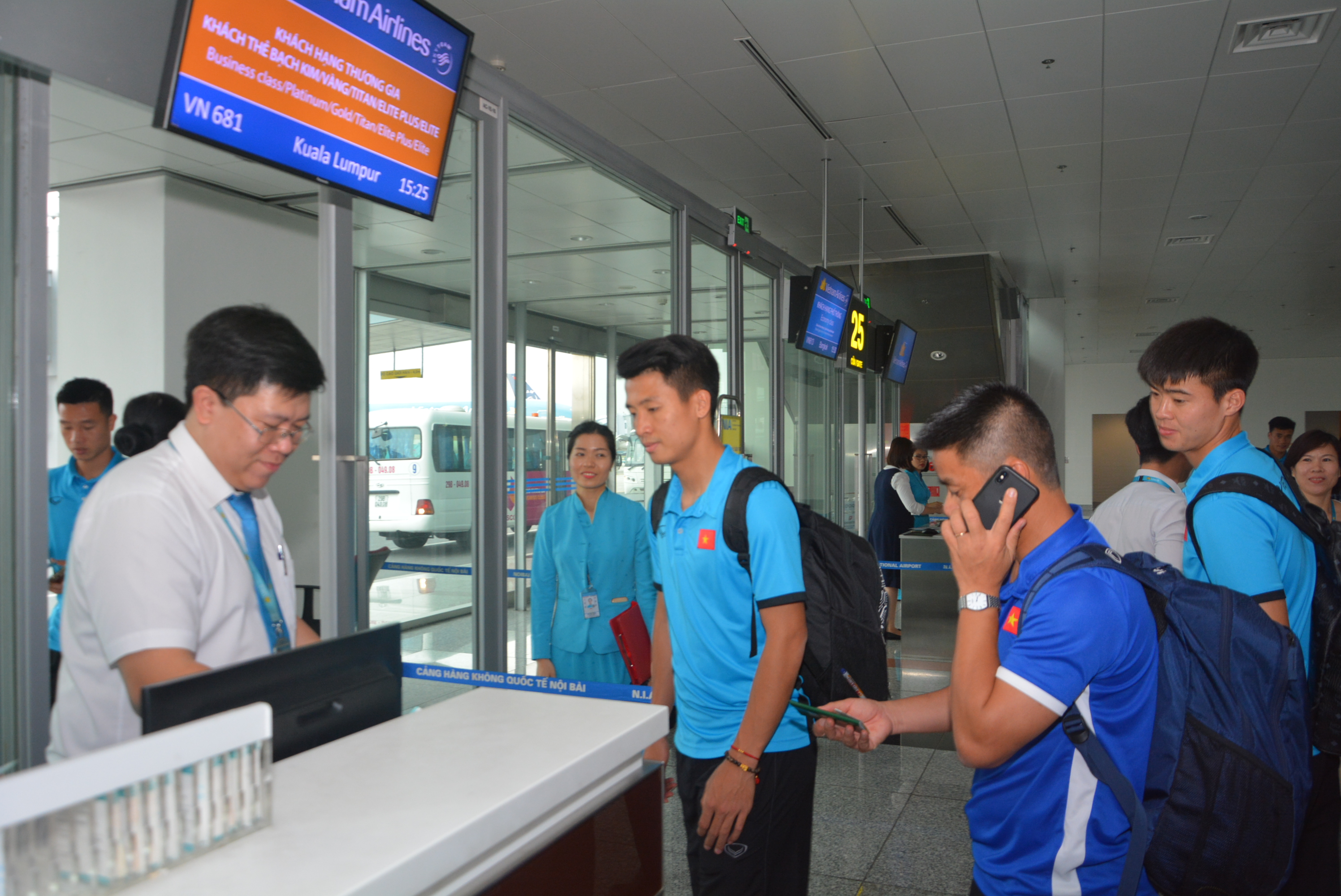 Các cầu thủ đội tuyển Việt Nam làm thủ tục check in tại sân bay Nội Bài
