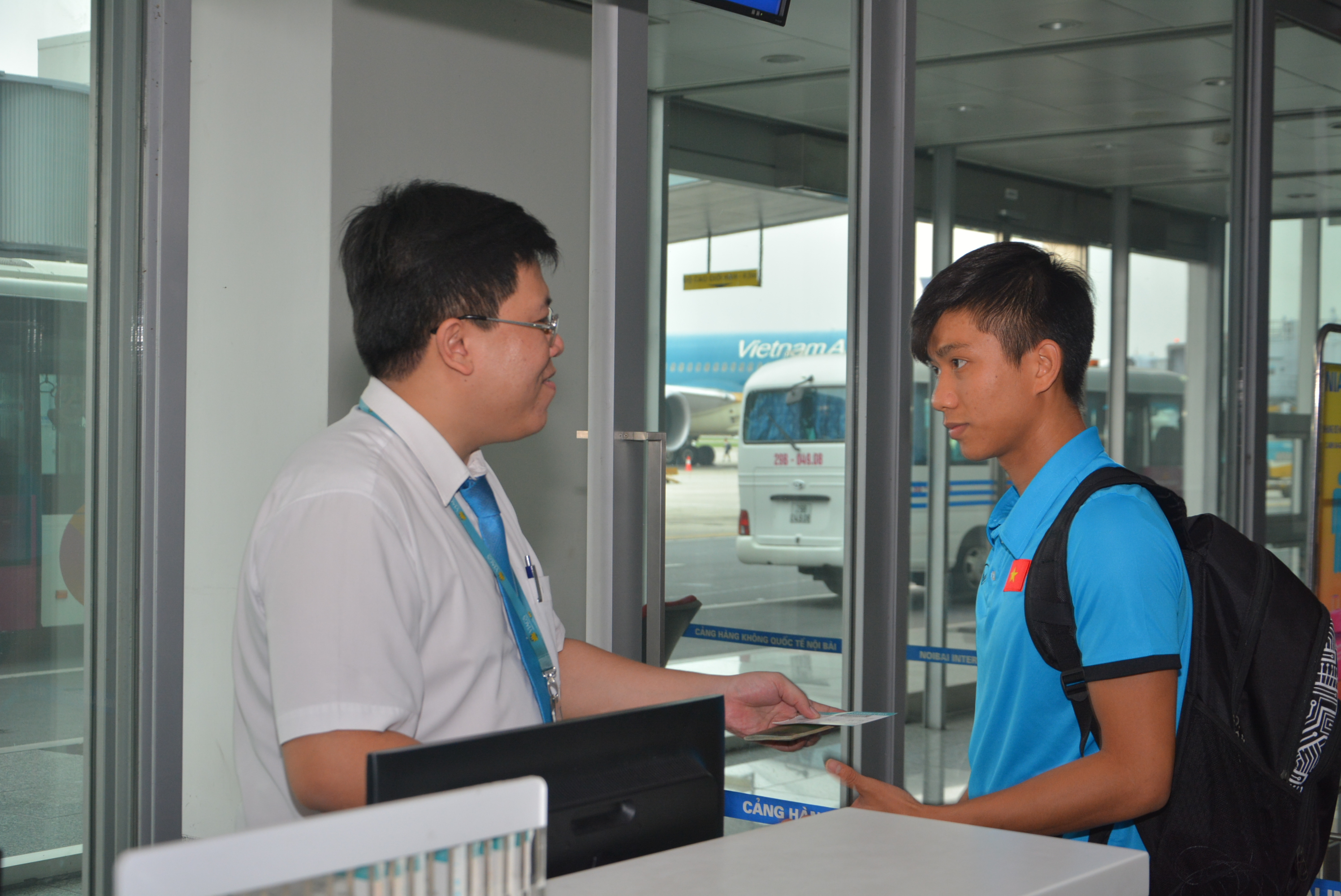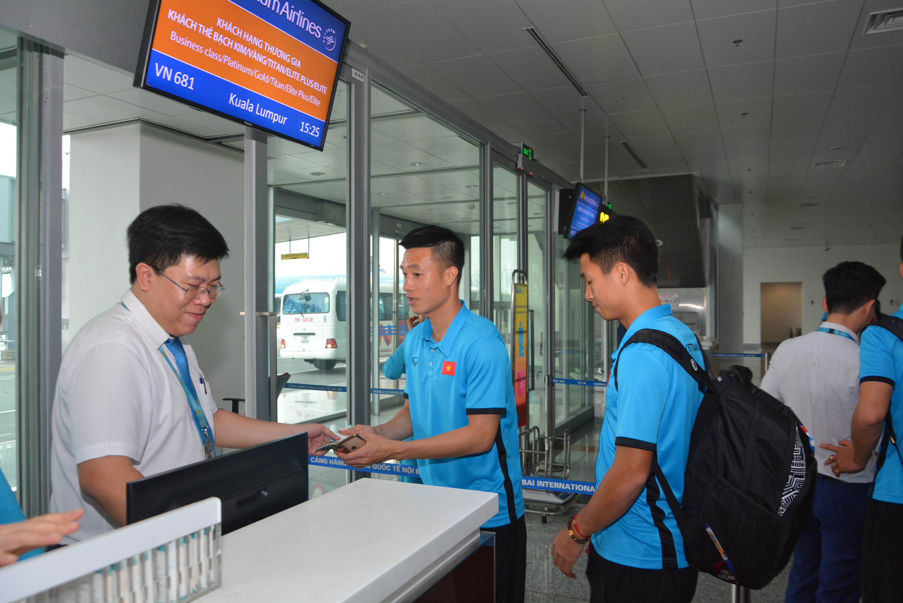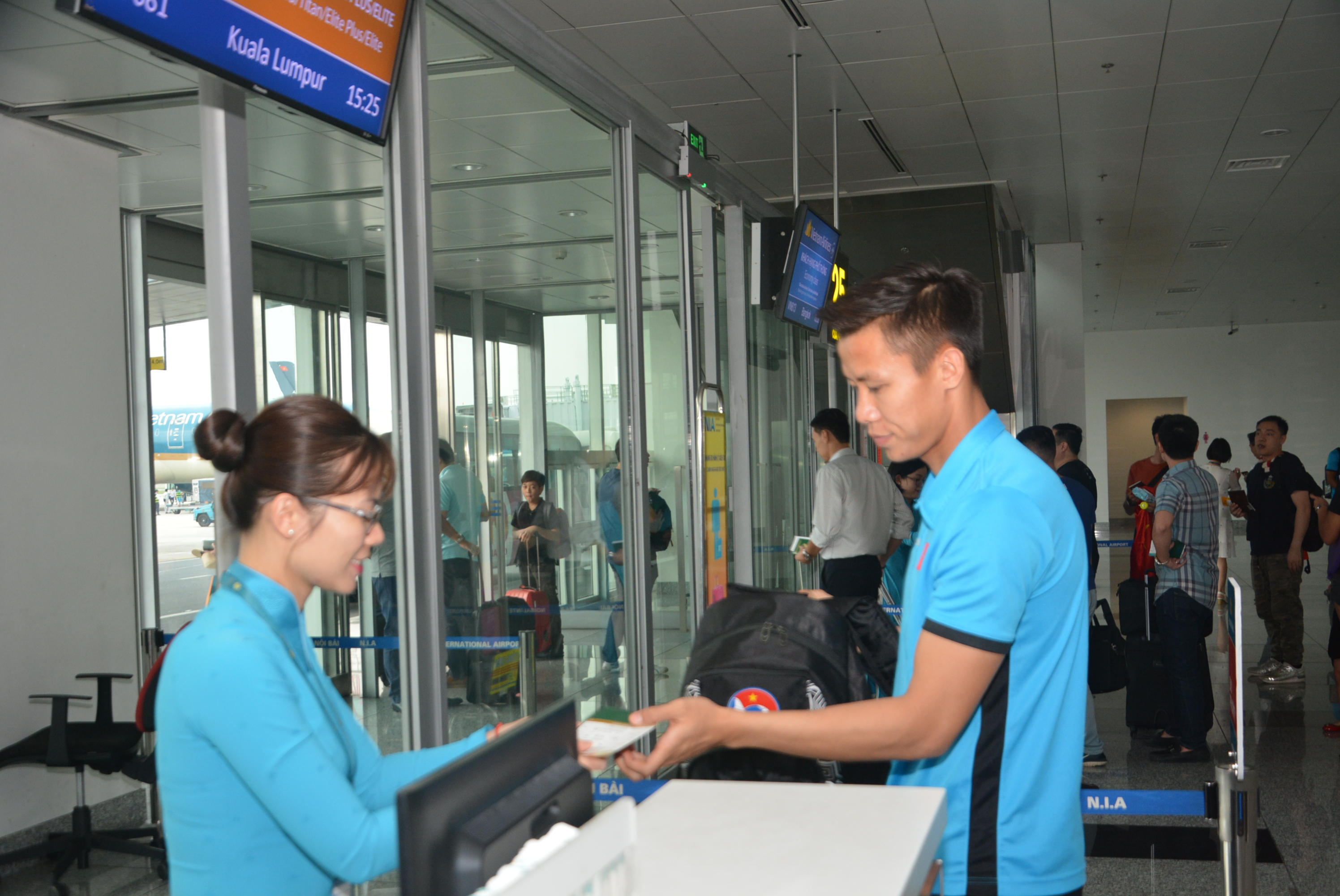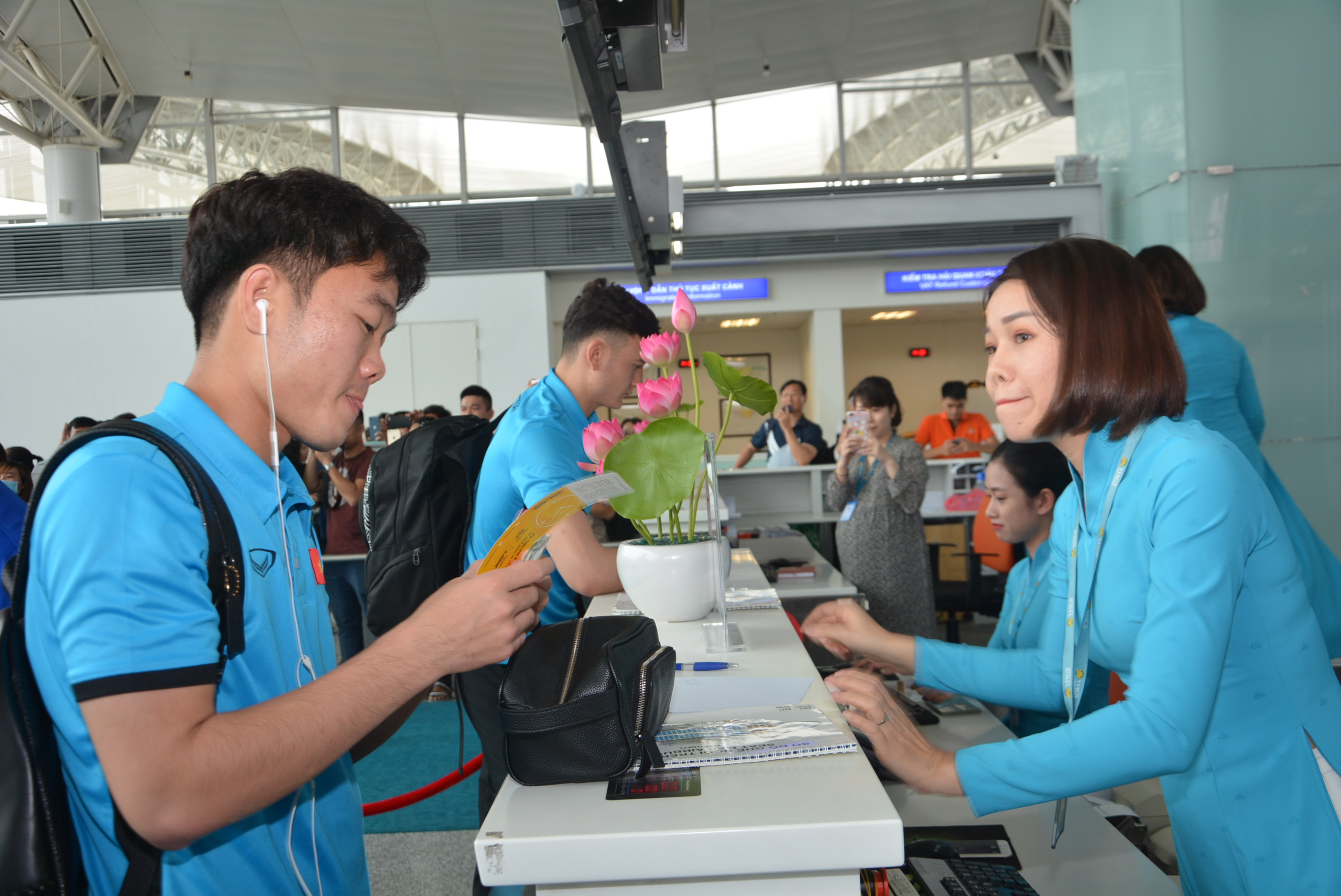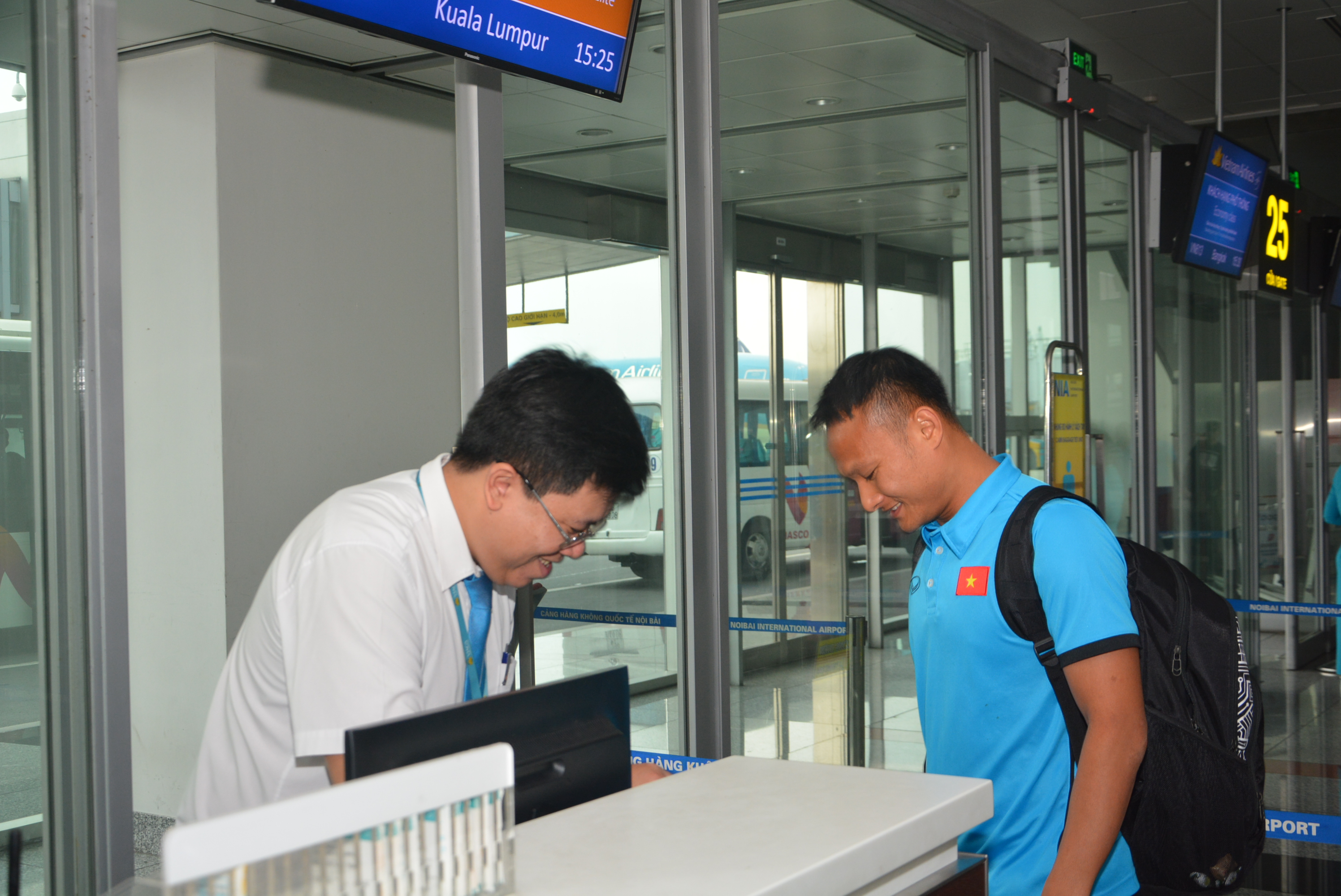Các cầu thủ đội tuyển Việt Nam làm thủ tục check in tại sân bay Nội Bài