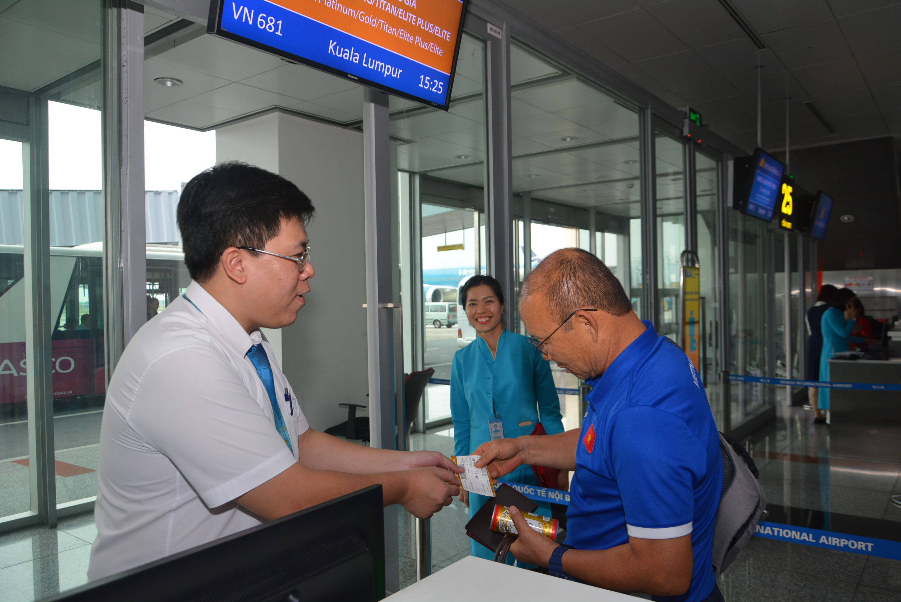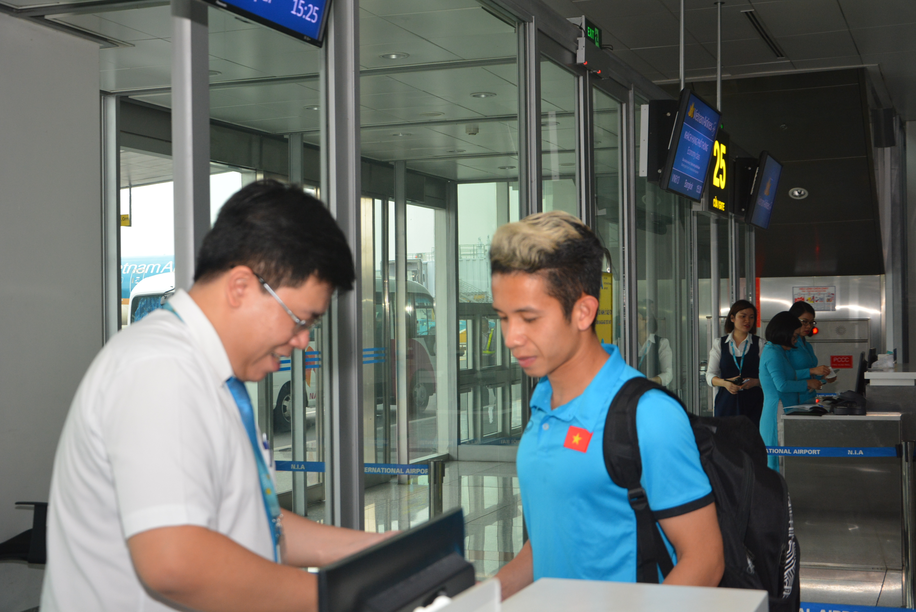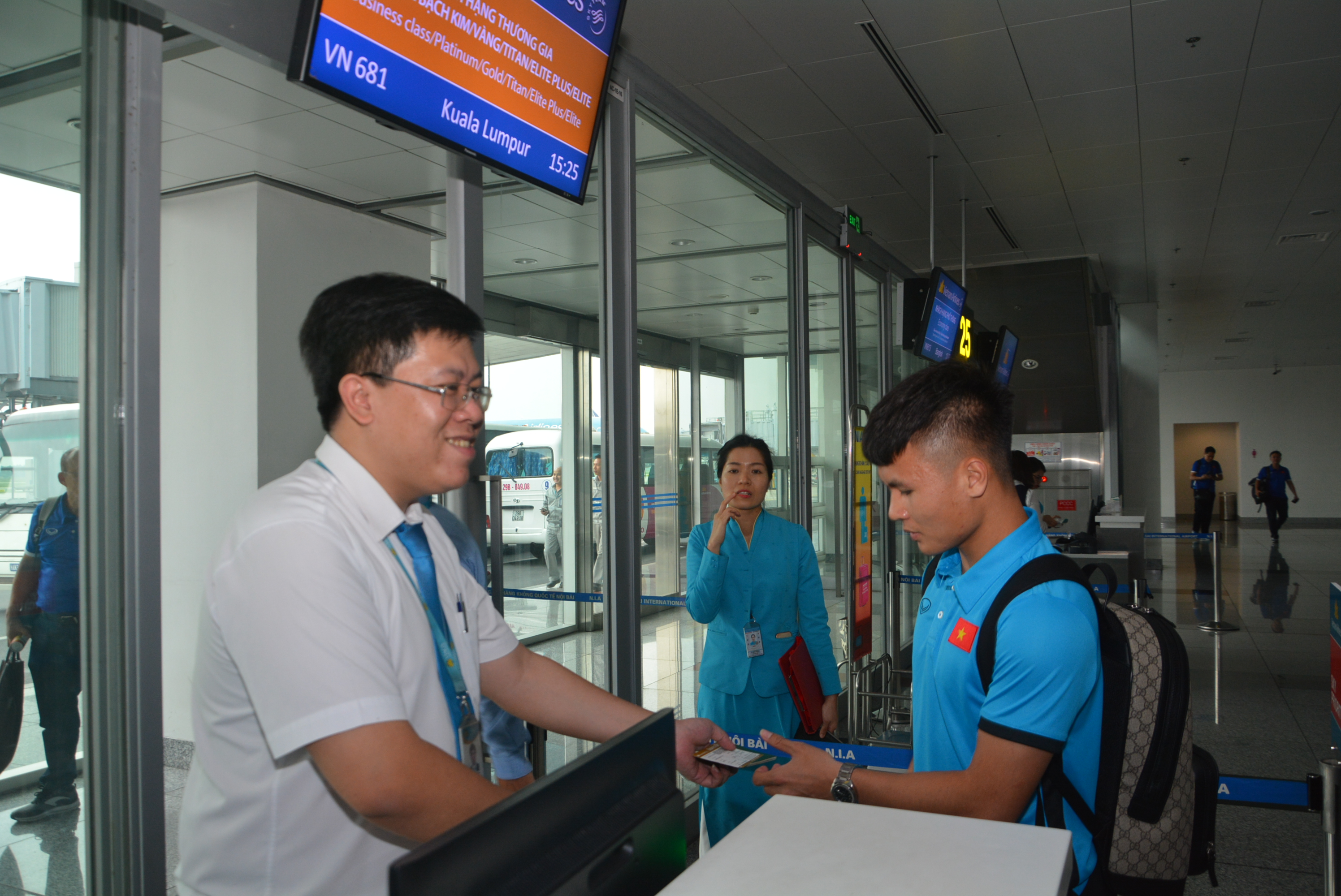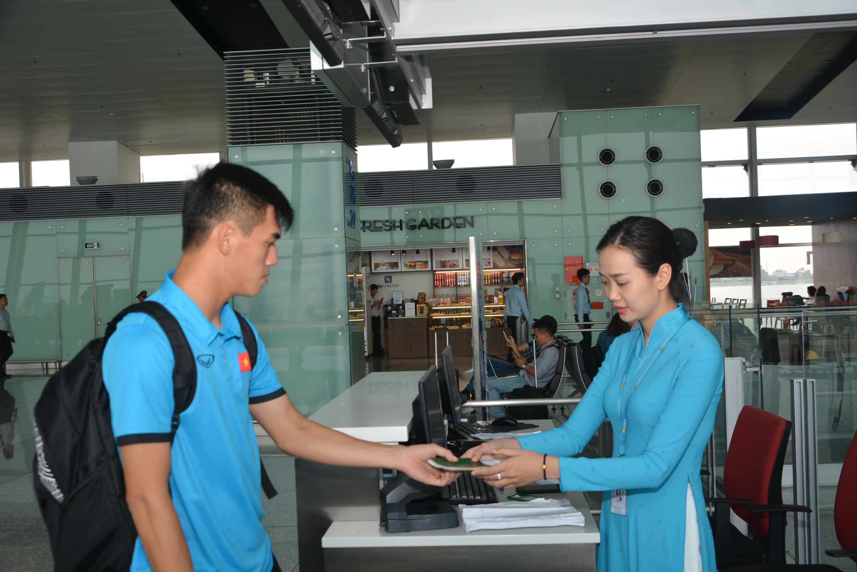 Các cầu thủ đội tuyển Việt Nam làm thủ tục check in tại sân bay Nội Bài