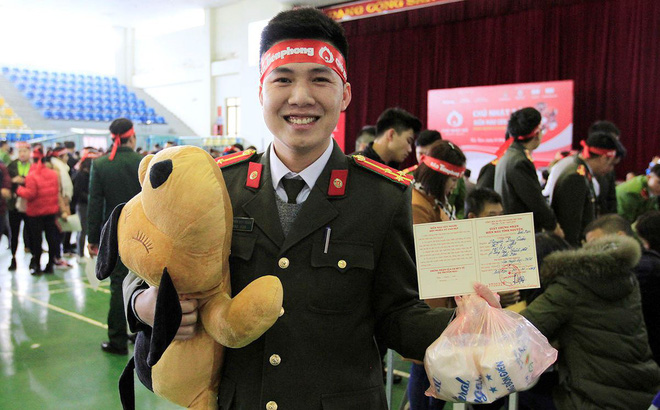 Trong số những người hiến máu đầu tiên có thượng úy Nguyễn Duy Quân, hiện công tác tại Công an tỉnh Bắc Kạn. Vừa hiến xong 350ml máu, tươi cười nhận thú bông và quà của nhà tài trợ từ Ban tổ chức, Quân nói, đã quen hiến máu từ hồi còn là sinh viên. Trung bình, mỗi năm Quân hiến hai lần, tính đến nay đã là lần thứ 19.