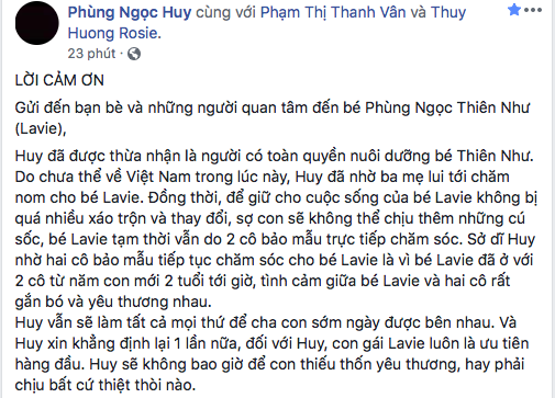 “Và Huy xin khẳng định lại 1 lần nữa, đối với Huy, con gái Lavie luôn là ưu tiên hàng đầu. Huy sẽ không bao giờ để con thiếu thốn yêu thương, hay phải chịu bất cứ thiệt thòi nào. Đến thời điểm hiện tại, Huy đã được toàn quyền nuôi dưỡng và chăm sóc bé Lavie theo đúng quy định pháp luật. Huy xin gửi lời cám ơn chân thành nhất đến những người đã hết lòng tư vấn và giúp đỡ cho Huy có được quyền nuôi dưỡng con gái, làm tròn trách nhiệm của người cha theo đúng quy định của pháp luật.