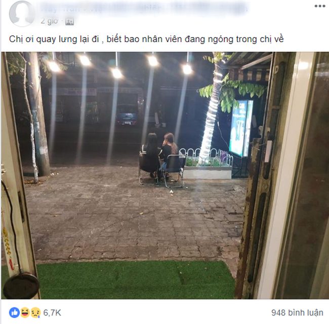 Cụ thể, 2 cô gái đi cafe chuyện trò, thế nhưng đến giờ quán đóng cửa cả 2 cô gái vẫn mải mê tâm sự. Khó chịu với khách nhưng lại không lên tiếng nhắc nhở khéo léo, 1 nhân viên của quán đã chụp bức ảnh 2 cô gái và đăng tải lên 1 group đông thành viên kèm theo caption có phần mỉa mai: “Chị ơi, quay lưng lại đi, biết bao nhân viên đang ngóng trông chị về”.