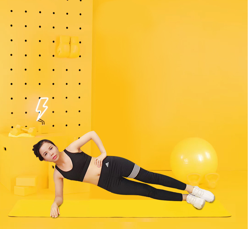 Với động tác này bạn bắt đầu bằng cách nằm nghiêng bên phải, chân trái để trên đỉnh chân phải, cẳng tay phải đặt trên thảm, khủy tay dưới vai.