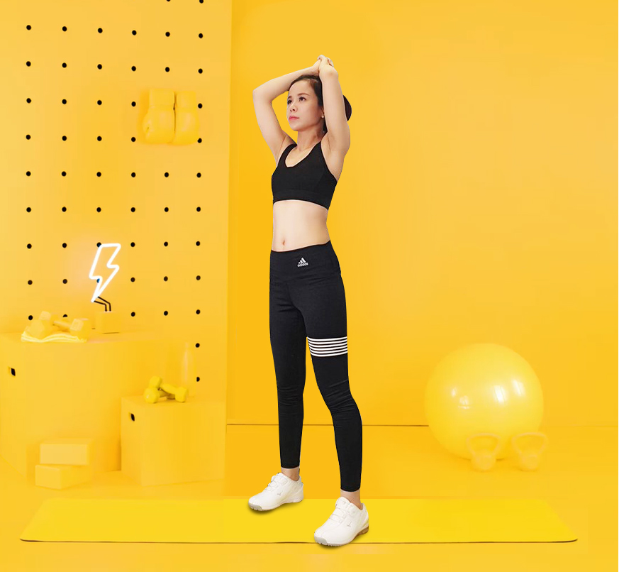 Trước hết bạn hãy đứng thẳng trên sàn, hai chân mở rộng bằng vai, hai tay nắm vào nhau và thực hiện động tác như đang cầm gươm chém.