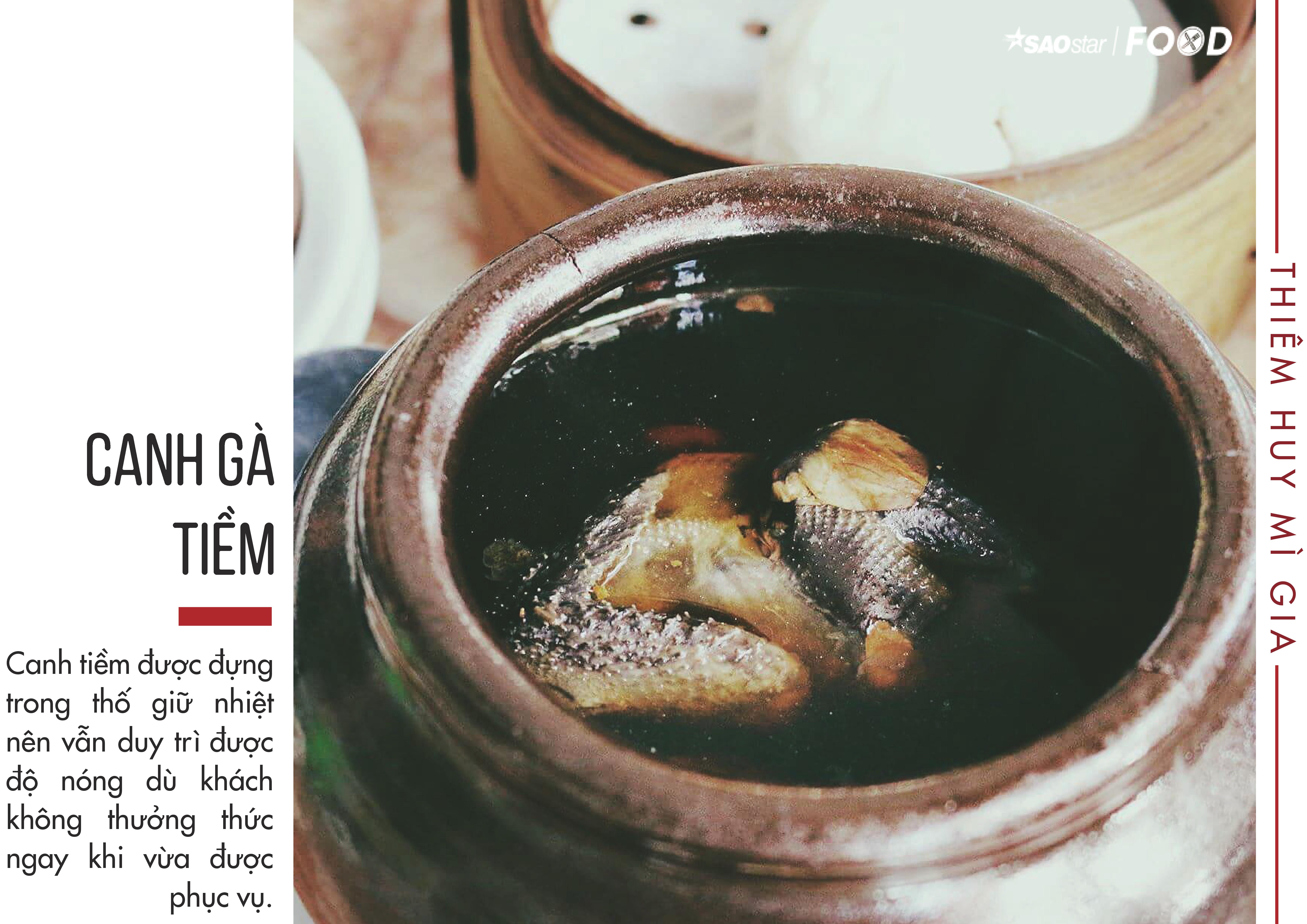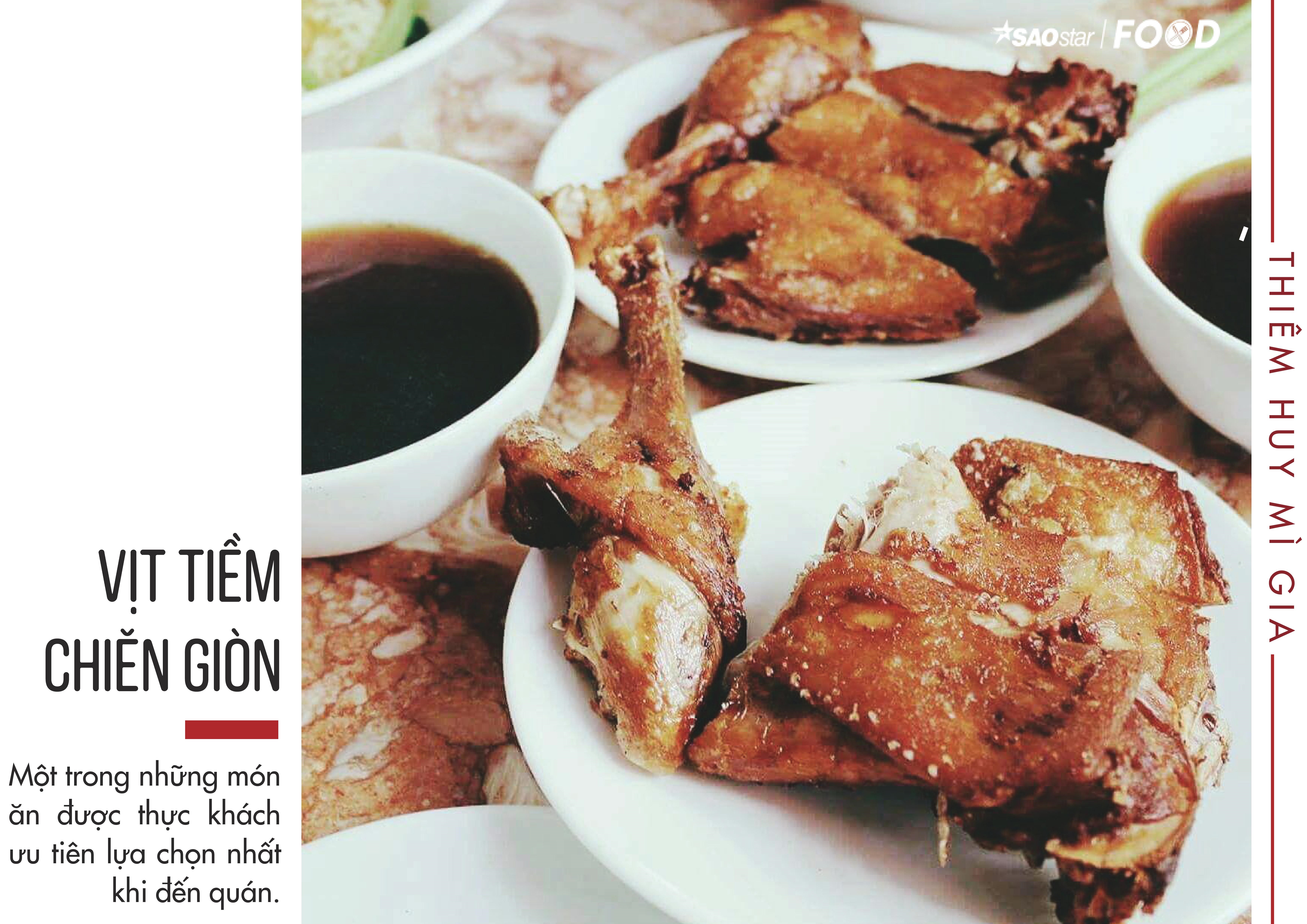 Đa dạng là thế nhưng thực khách thường tìm đến Thiêm Huy mì gia vì tô mì vịt tiềm chất lượng. Mì ở đây chuẩn đúng kiểu của người Hoa, vàng ươm, sợi mảnh, được trụng vừa chín tới. Quán có cả hai loại mì vịt tiềm chiên giòn và vịt tiềm mềm thông thường. Phần vịt ăn cùng khá lớn và được ướp nguyên liệu gia truyền thấm đẫm, mềm thịt, hương vị đậm đà.