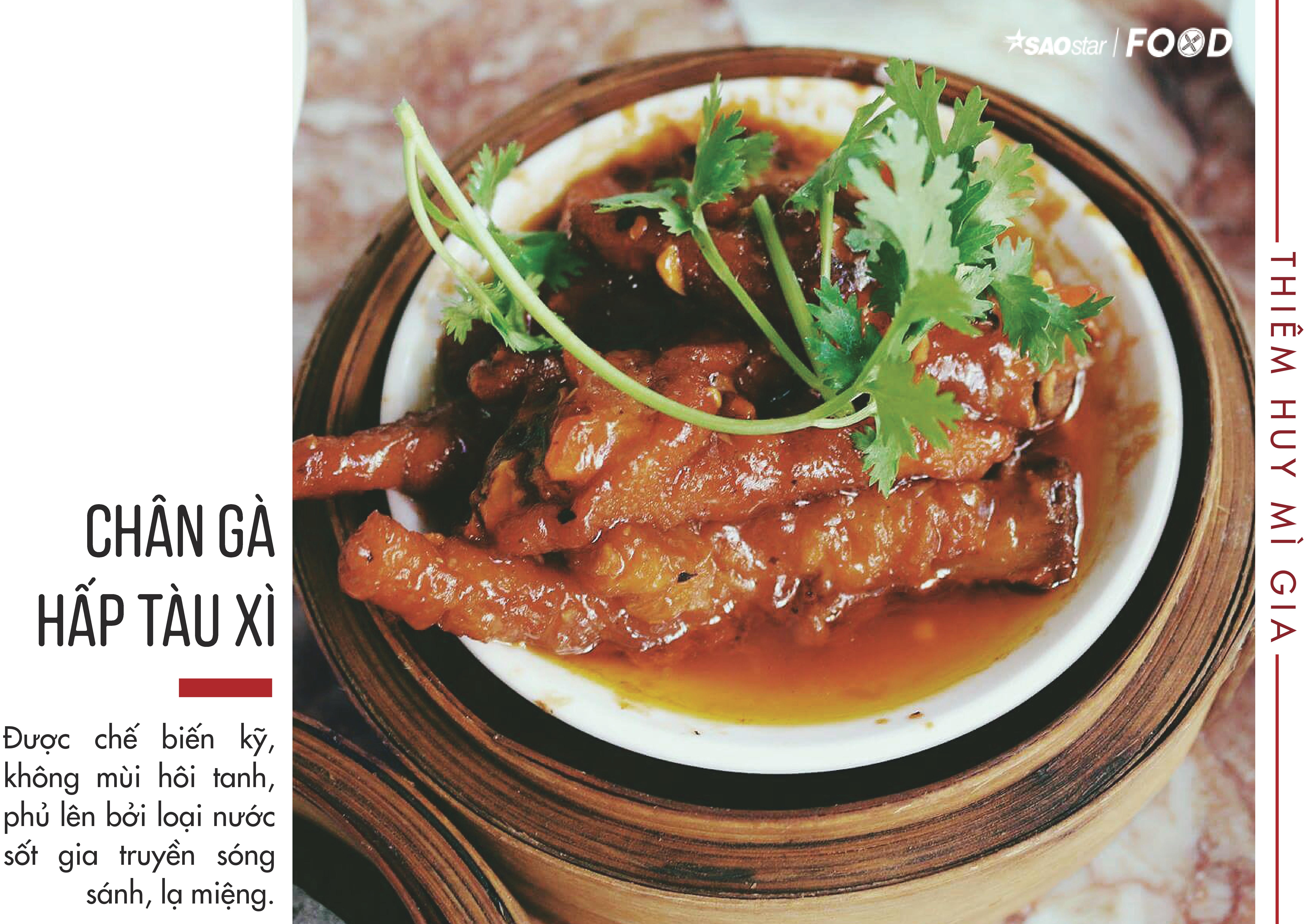 Chân gà hấp tàu xì là món ăn đáng để thử khi ghé đến Thiêm Huy mì gia. Phần chân gà được làm sạch sẽ, không mùi hôi tanh được phủ lên bởi loại nước sốt gia truyền sóng sánh, đầy rực rỡ. Một trong những vướng mắc khiến thực khách ngại ngần khi dùng chân gà bởi vì dễ bị mắc xương nhưng chân gà hấp tàu xì ở đây đã được nấu nhừ để khách không gặp khó khăn khi ăn.