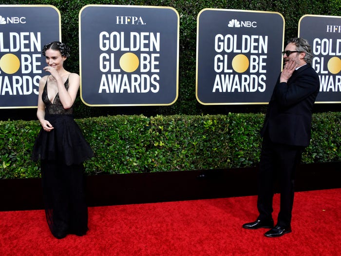 Tại Quả cầu vàng 2020, Joaquin Phoenix tạm thời quên mất tạo dáng trên thảm đỏ để ngắm nhìn vị hôn thê Rooney Mara. Khi Mara nhận thấy Phoenix không còn tạo dáng bên cạnh nữa, cô phải che miệng cười khúc khích. Cặp đôi gặp nhau trên trường quay ‘Her’ vào năm 2012, hẹn hò trong ba năm rồi tuyên bố đính hôn vào năm ngoái.