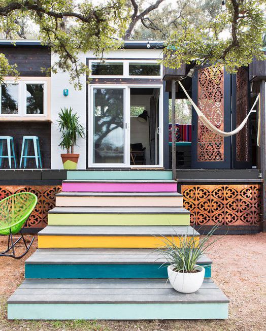 Cầu thang đầy sắc màu với chiếc võng sẽ cho bạn phút giây thư giãn tuyệt vời phía sau ngôi nhà.