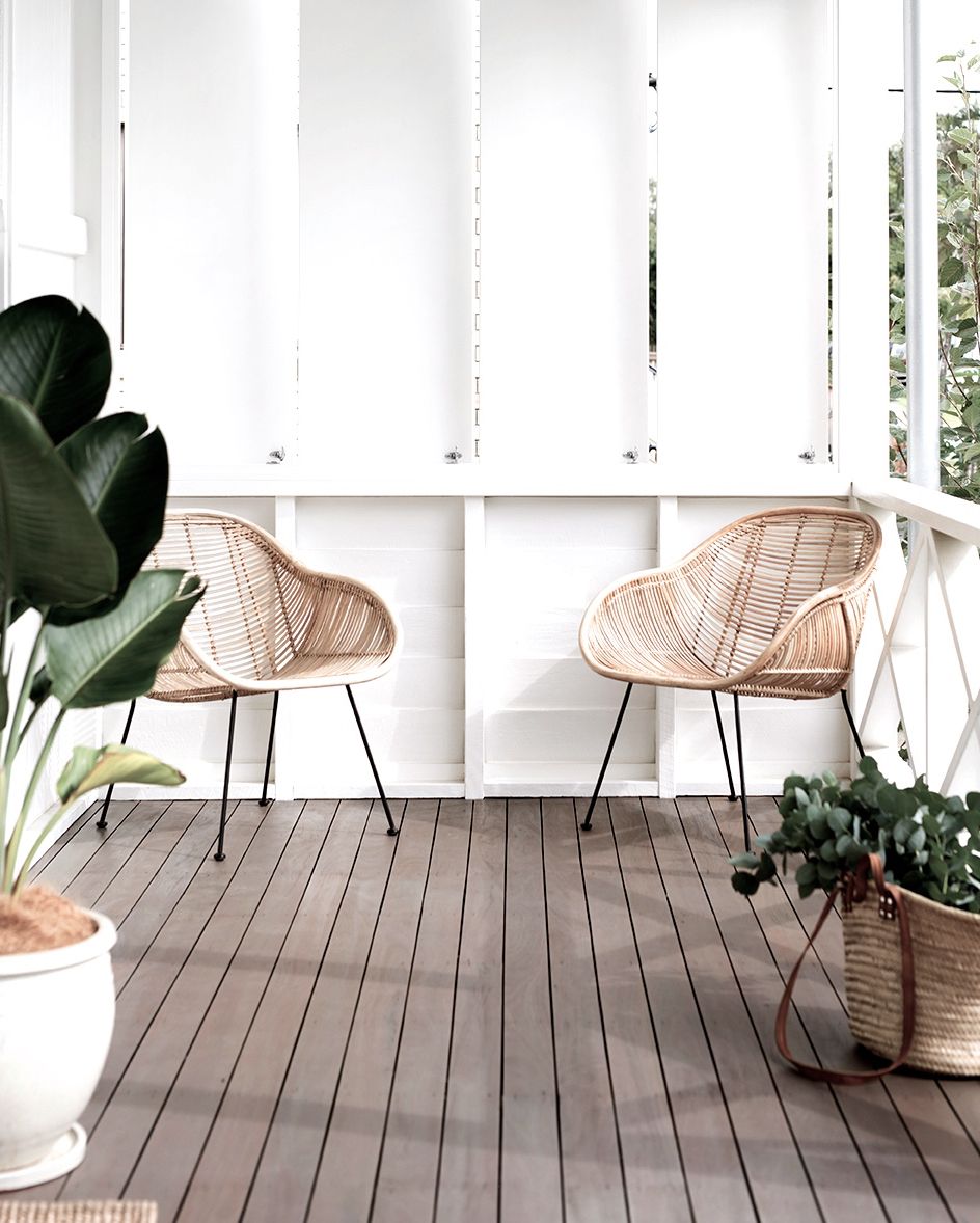 Nếu muốn tối giản mọi thứ và tạo không gian vùng nhiệt đới thì bạn có thể sơn màu trắng cho bức tường gỗ xung quanh cùng vài chậu cây đơn giản cùng những chiếc ghế mây thanh lịch này.