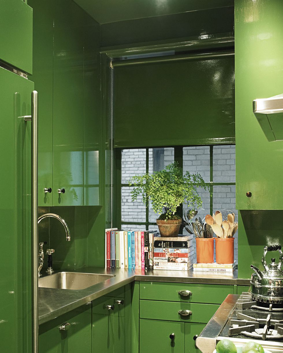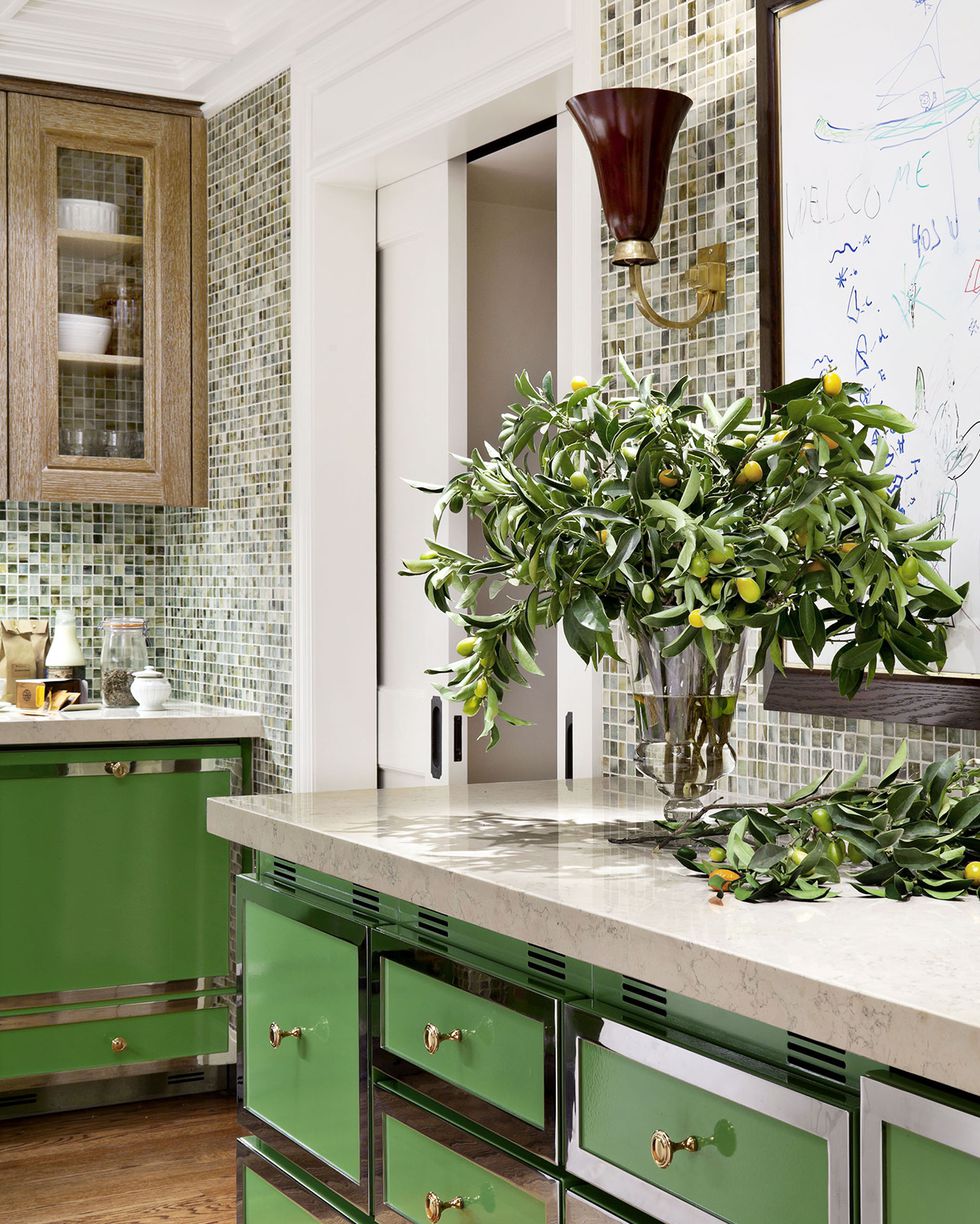Chiếc tủ màu xanh lá ấn tượng cùng với mặt bàn bằng cẩm thạch cùng một chiếc cây nhỏ tạo nên gian bếp có màu xanh ấn tượng.