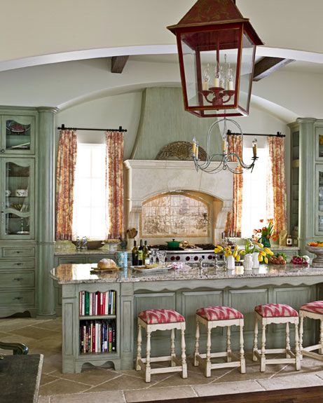 Một không gian giống như trong các câu chuyện cổ tích. Những màu xanh khá cổ điển trong thiết kế của căn bếp này.