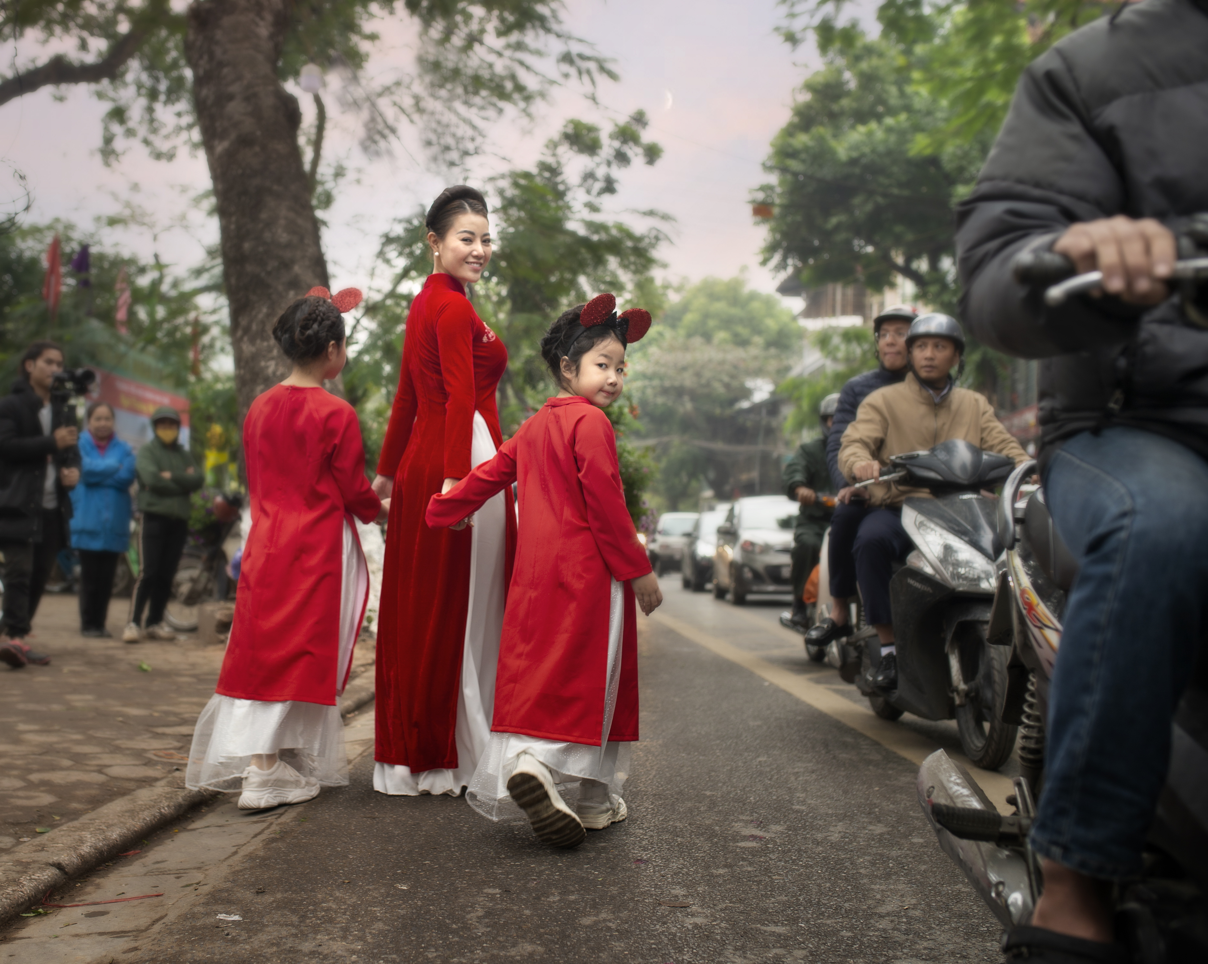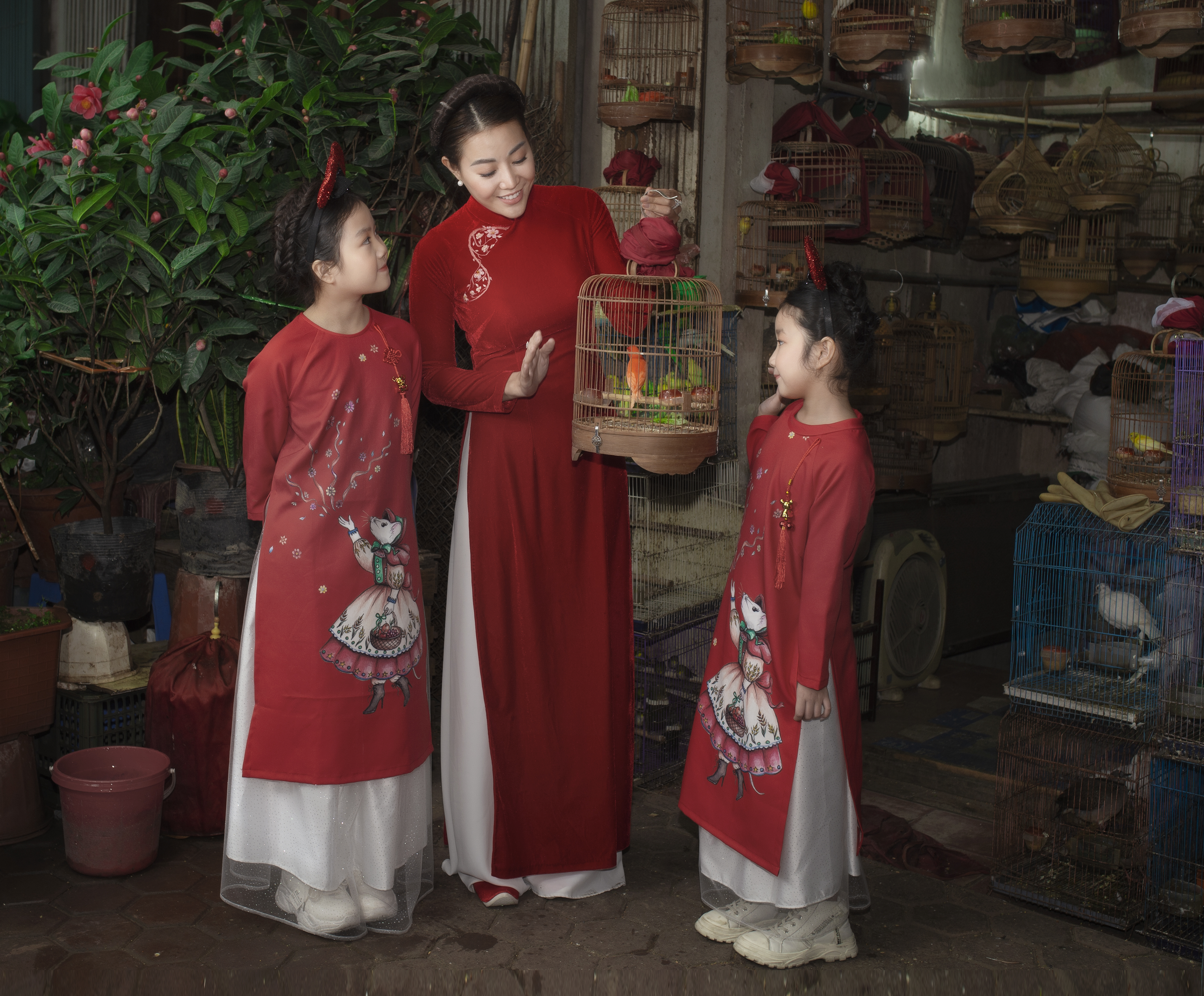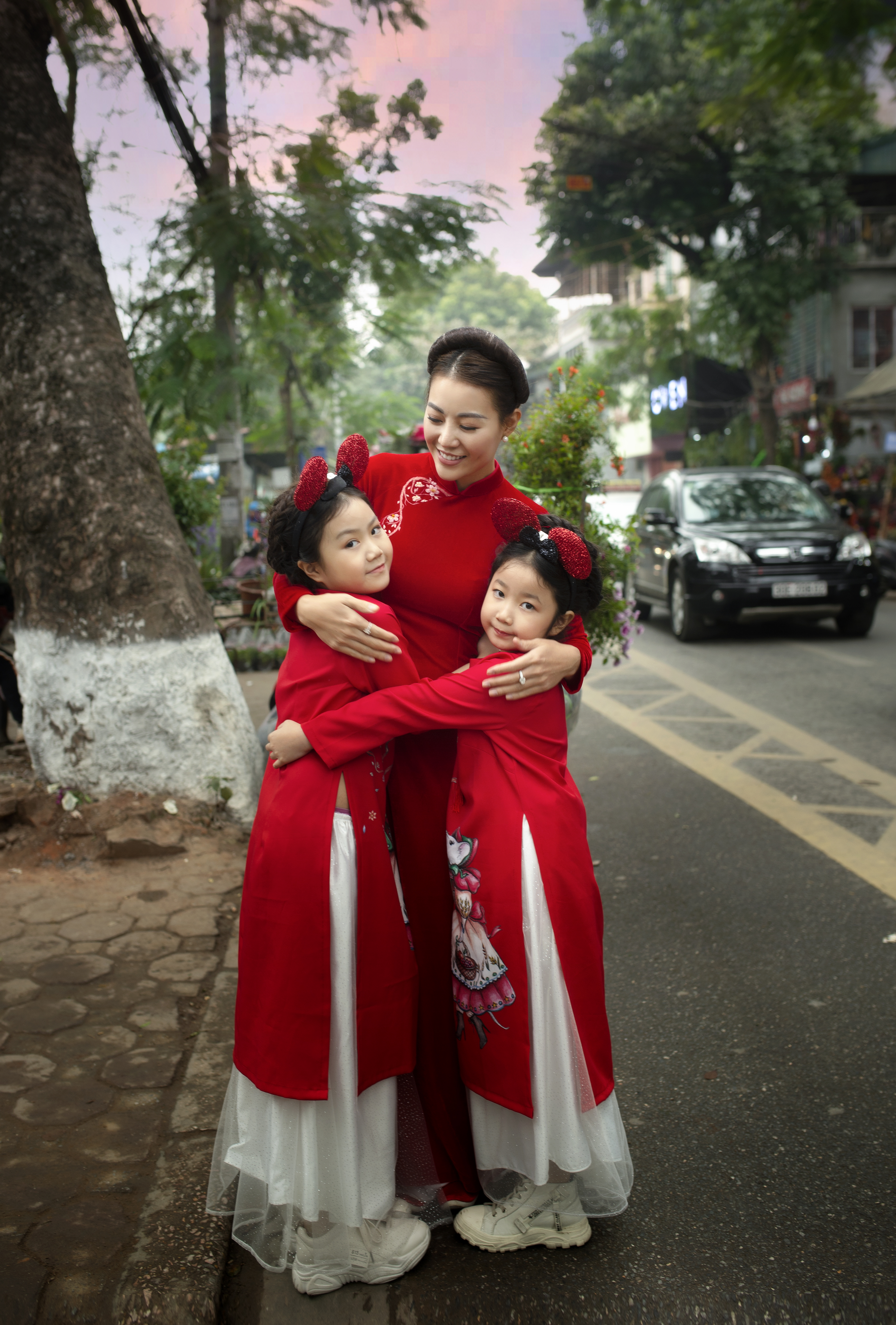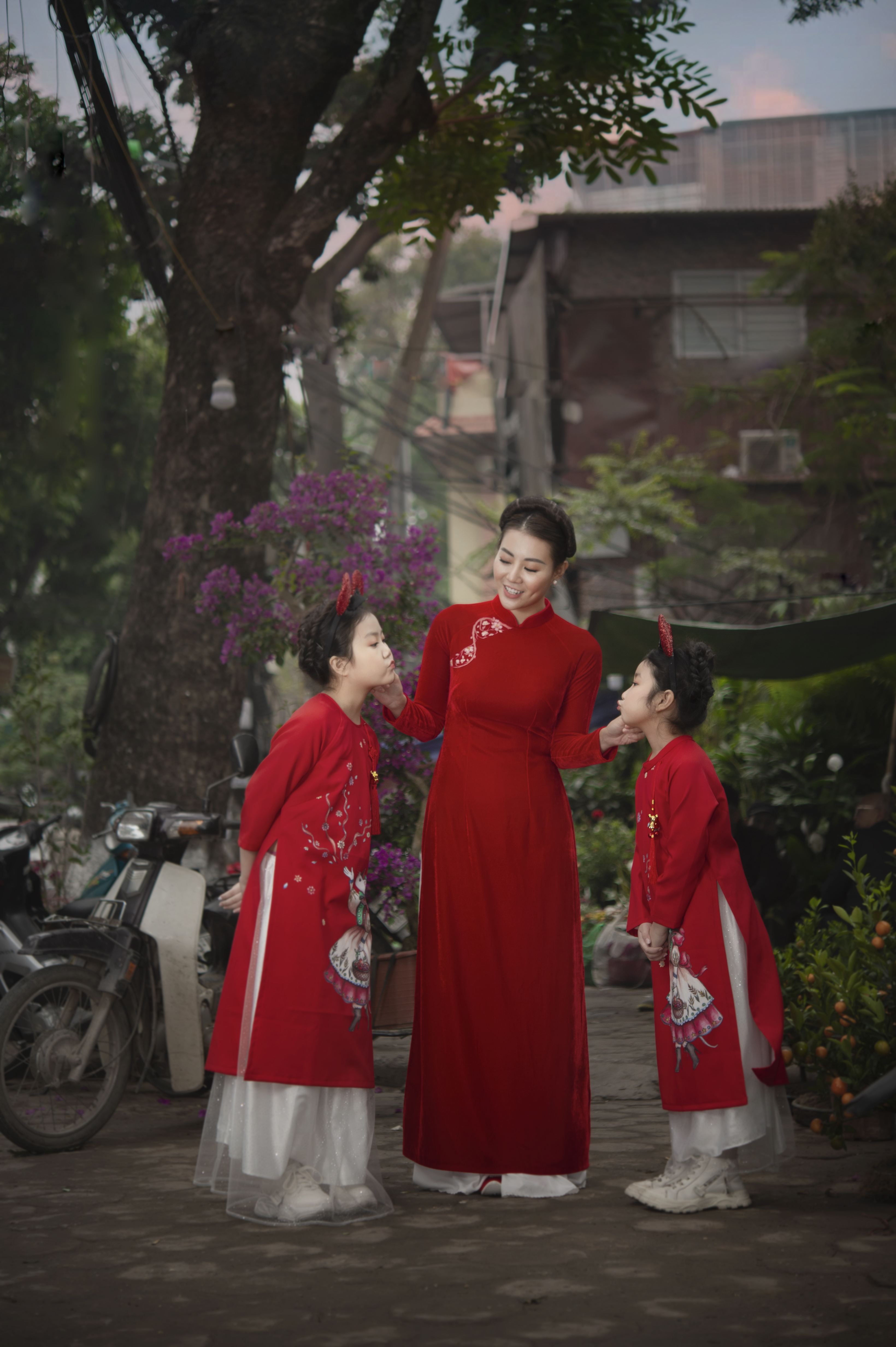 Cả 3 mẹ con đều mặc áo dài đỏ nổi bật