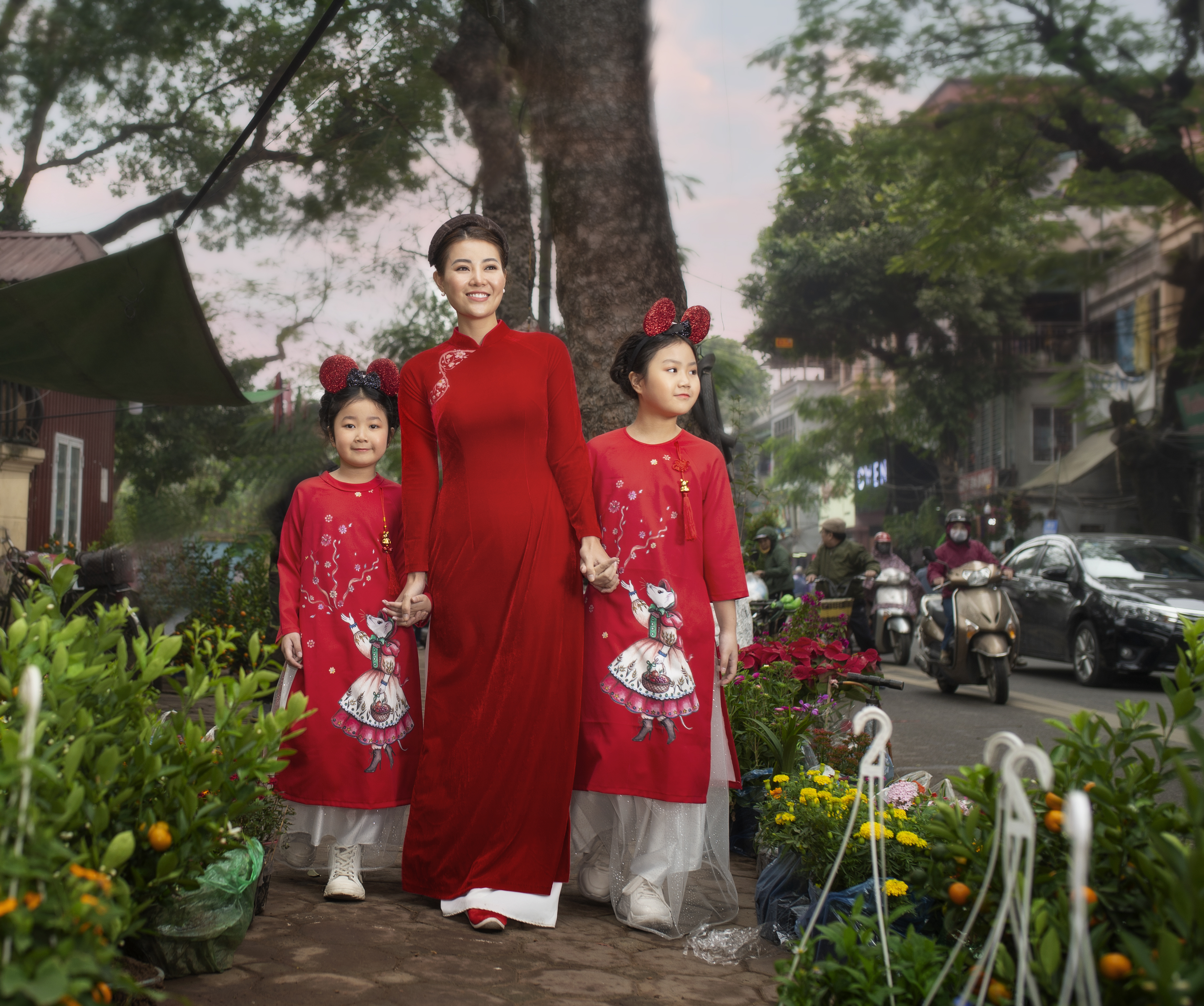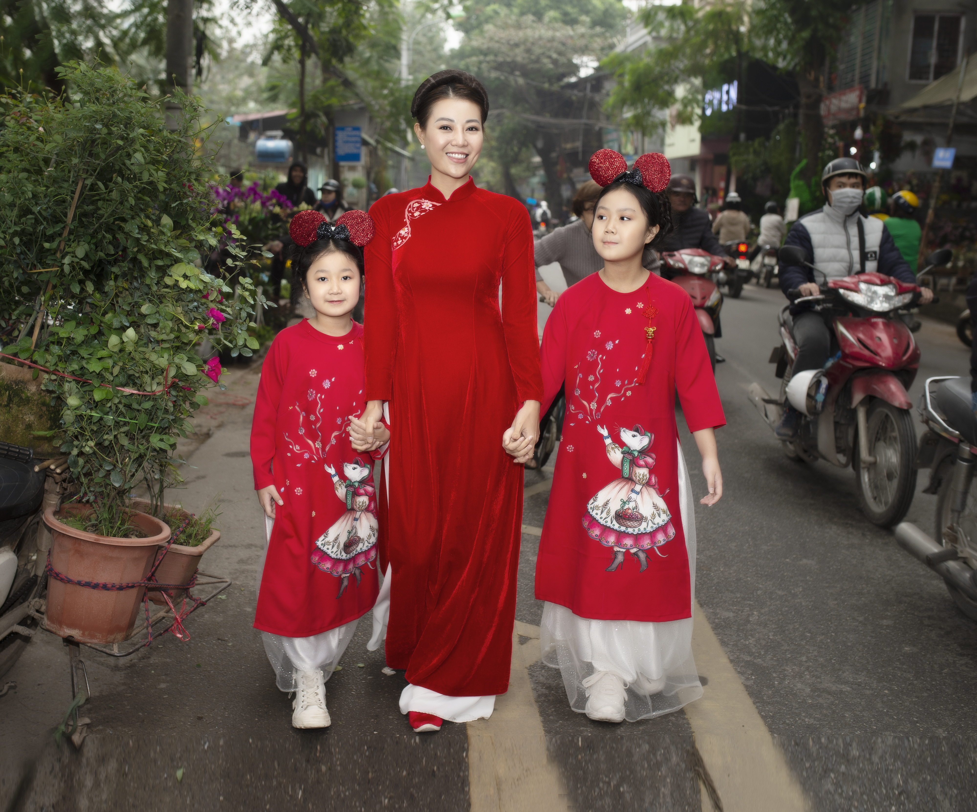 2 con gái của Thanh Hương mặc áo dài có họa tiết hình chuột và đeo chiếc cài tóc tai chuột