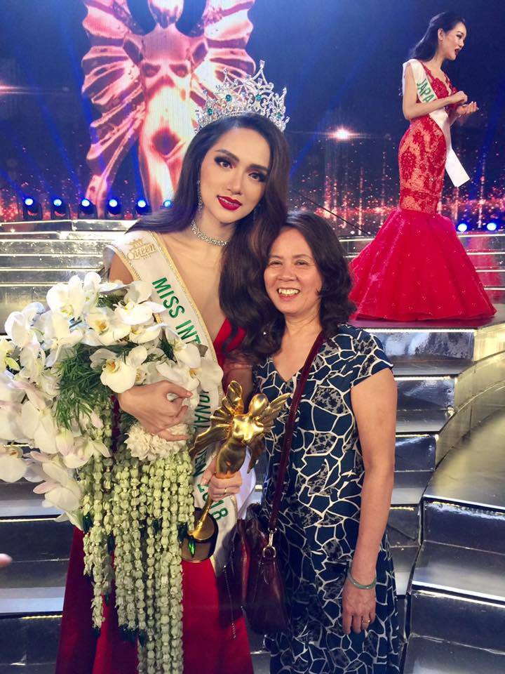 Giây phút đăng quang Hoa hậu chuyển giới Quốc tế, Hương Giang đã vô cùng vui mừng khi có sự xuất hiện của bố mẹ. Mẹ Hương Giang chia sẻ rằng “Tôi rất tự hào và hạnh phúc vì cuối cùng con gái đã một lần nữa thực hiện được ước mơ của mình”. Bà nhớ lại, 7 năm trước đây, Hương Giang đã một mình sang Thái chuyển giới nhưng giờ đây, khi trực tiếp được chứng kiến giây phút giây phút vinh quang của con gái, thì “điều đó quả thật rất hạnh phúc”.