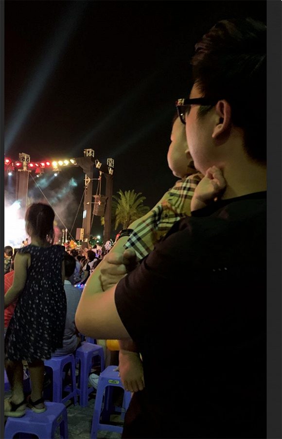 Khoảnh khắc Bé Kem được bố bồng, chăm chú xem văn nghệ đêm trung thu từ xa được Tú Anh chia sẻ trên story Instagram