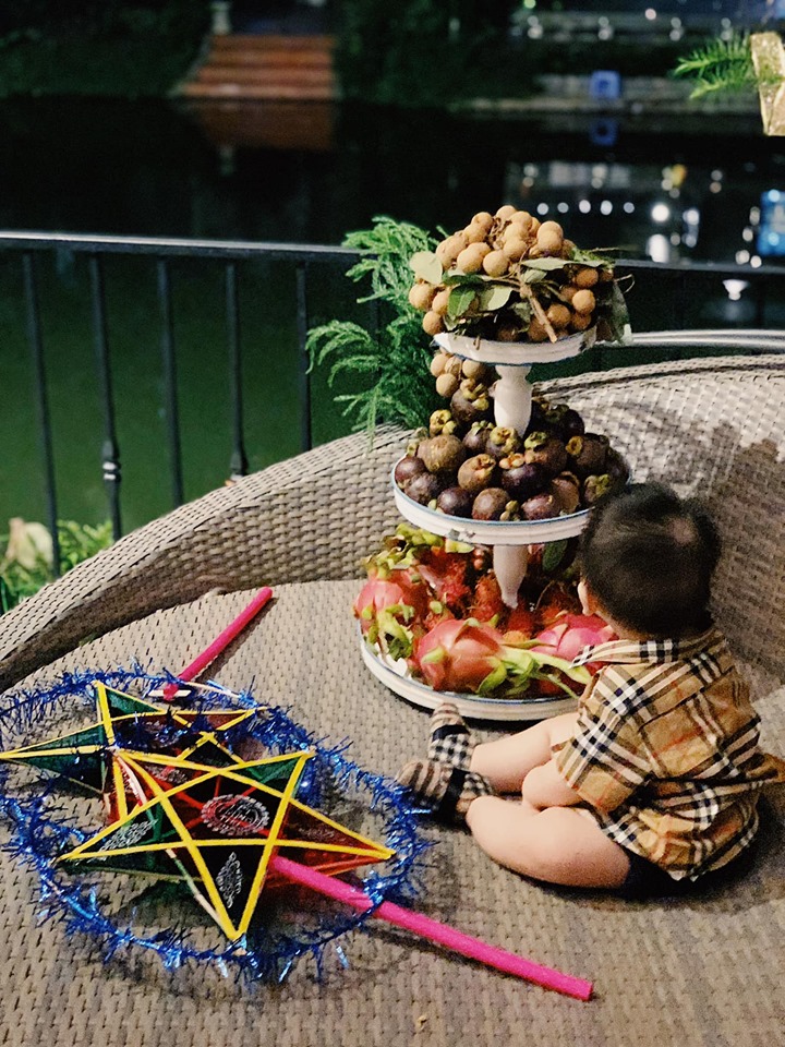 Như bao gia đình nghệ sĩ khác đều chia sẻ những hình ảnh đón trung thu bên gia đình và con cái lên mạng xã hội, Á hậu Tú Anh cũng thu hút nhiều sự quan tâm của mọi người khi chia sẻ loạt ảnh phá cỗ Trung thu bên chồng và con trai nhỏ lên trang cá nhân của mình.