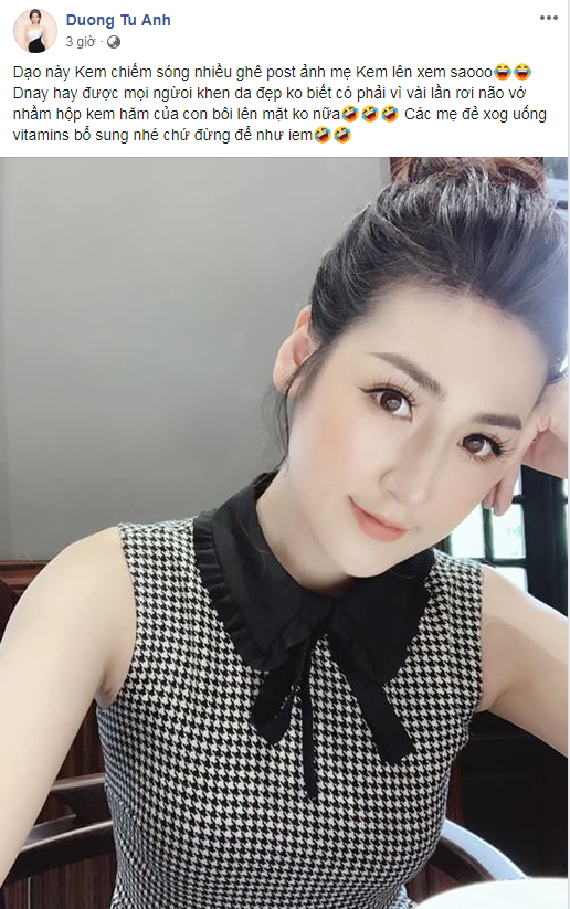 “Dạo này Kem chiếm sóng nhiều ghê, post ảnh mẹ Kem lên xem sao. Dạo này hay được mọi người khen da đẹp không biết có phải vì vài lần rơi não vớ nhầm hộp kem hăm của con bôi lên mặt không nữa. Các mẹ đẻ xong uống vitamin bổ sung nhé chứ đừng để như em”