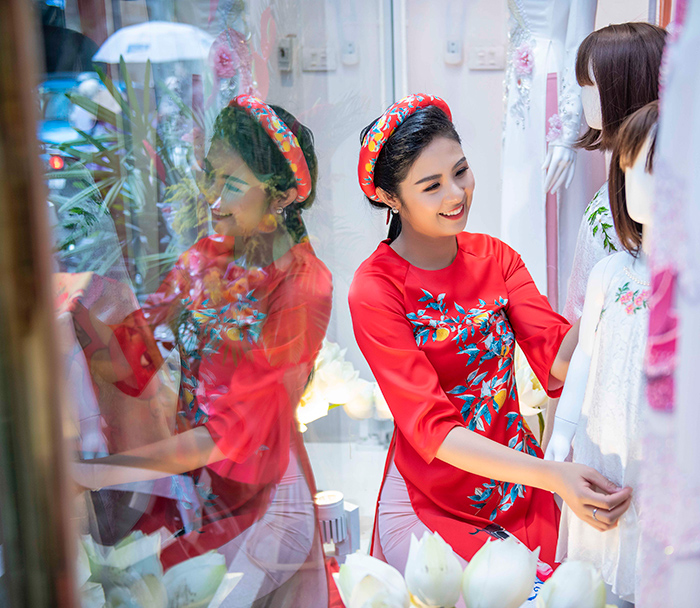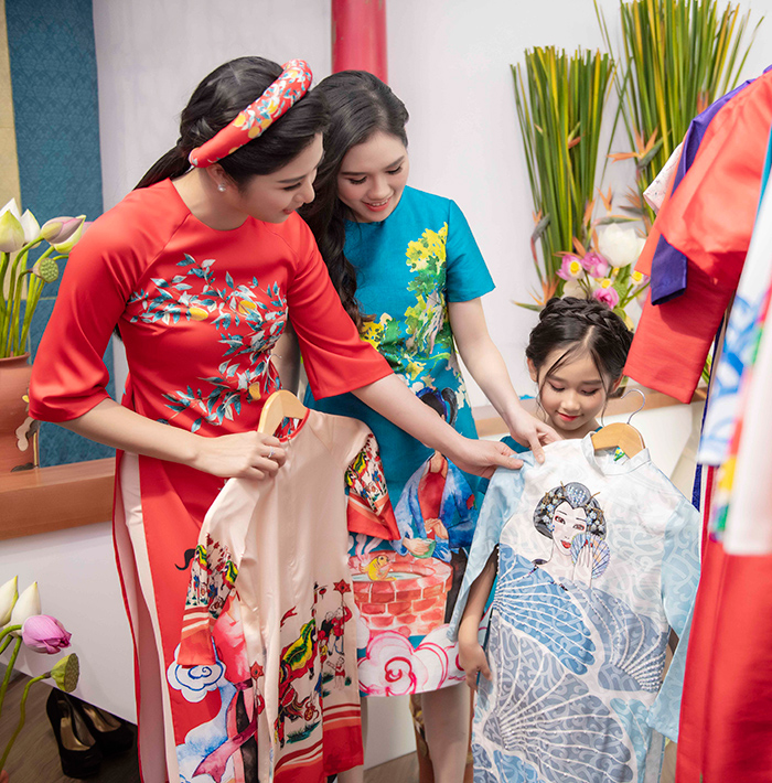 Con gái rượu Minh Tiệp tỏ ra dạn dĩ với đám đông và yêu thích các mẫu váy đầm, áo dài tại cửa hàng.