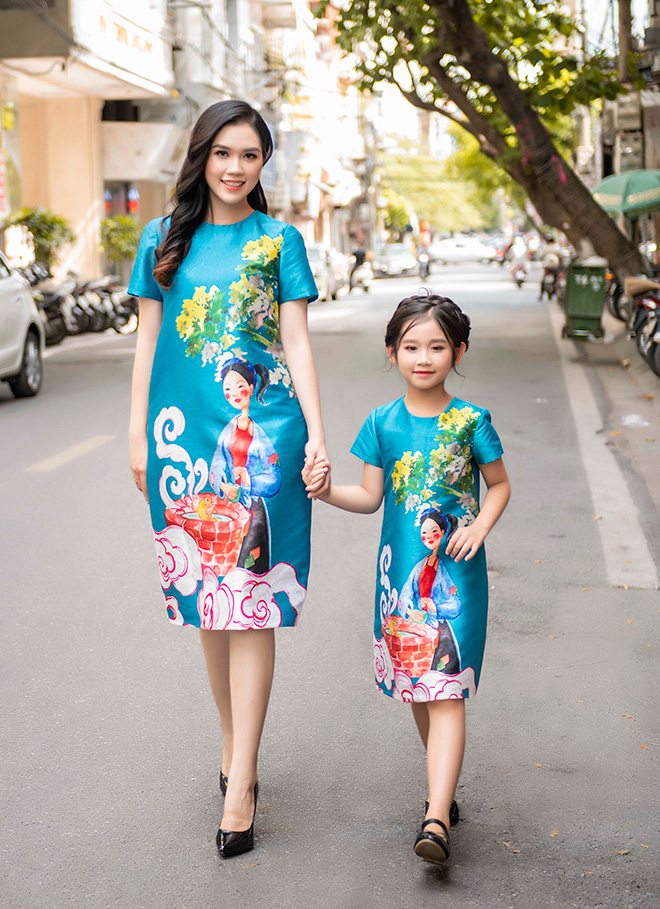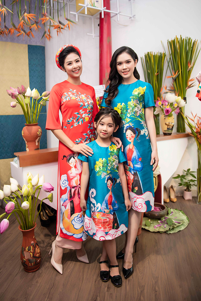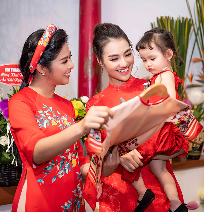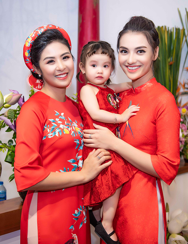 Tại sự kiện, ai cũng bất ngờ vì con gái yêu của diễn viên Minh Tiệp và Thùy Dương đã lớn bổng, rất xinh xắn. Ngay từ khi xuất hiện, bé gái đã hút mọi sự chú ý của ống kính nhiếp ảnh. Cô bé và mẹ Thùy Dương cùng mặc áo dài đôi màu xanh ngọc tươi mát.
