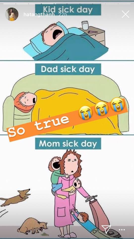 Cô đồng tình với thực trạng : con ốm được chăm sóc, chồng ốm được nghỉ ngơi, nhưng các bà mẹ ốm thì vẫn phải dọn dẹp nhà cửa, chăm sóc con cái bình thường.