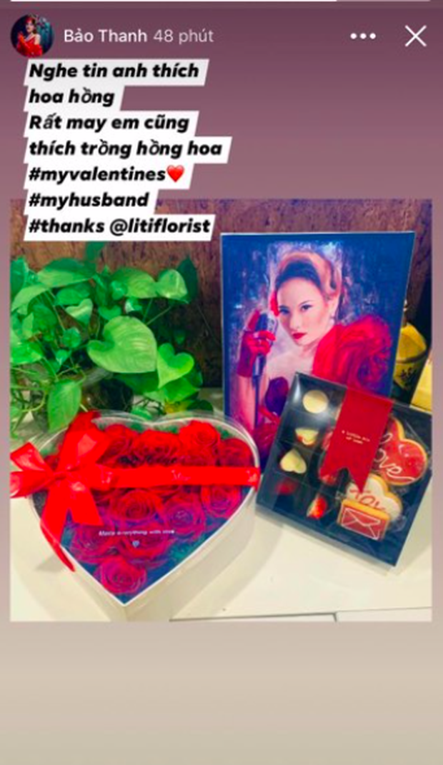 Trên trang cá nhân của mình, nữ diễn viên Bảo Thanh cũng khoe món quà được tặng từ ông xã, cô còn hài hước làm thơ đính kèm “Nghe nói anh thích hoa hồng, rất may em cũng thích hồng hoa. My Valentine. My husband”