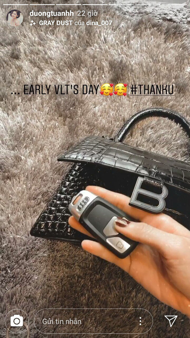 Á hậu Dương Tú Anh thì khiến mọi người không khỏi trầm trồ khi khoe được ông xã tăng một chiếc túi của thương hiệu BALENCIAGA có giá khoảng 40 triệu đồng. Ngoài ra, thiếu gia này còn mạnh tay tặng vợ một chiếc xe hơi hạng sang