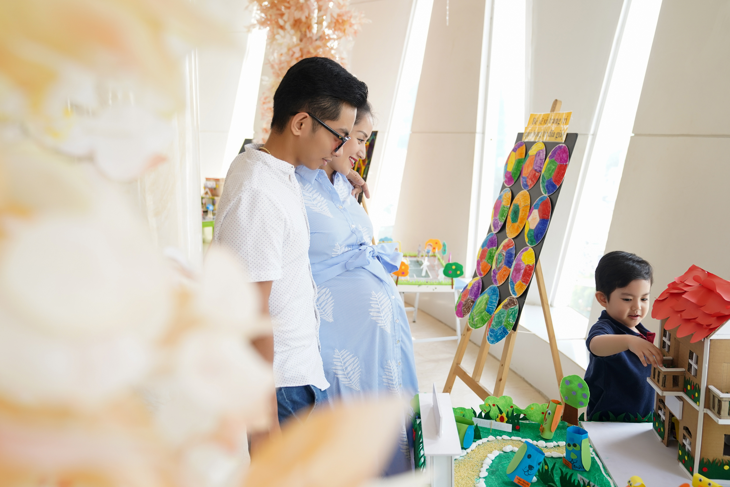 Cặp đôi hạnh phúc ngắm nhìn con trai chơi đùa.