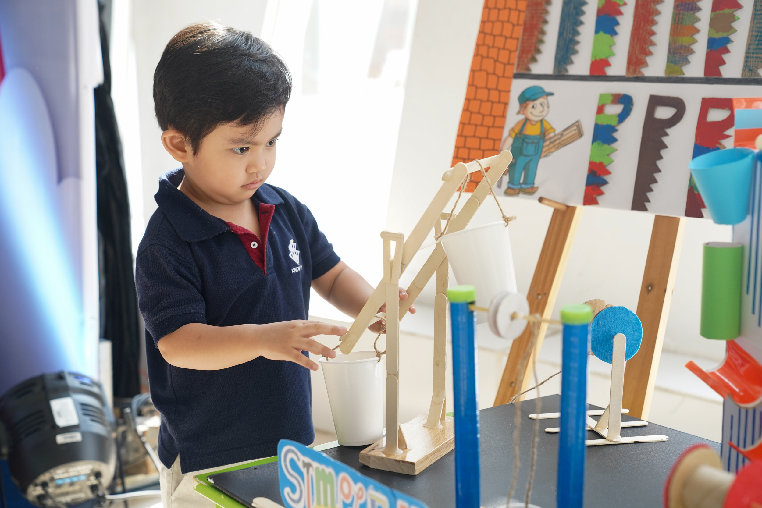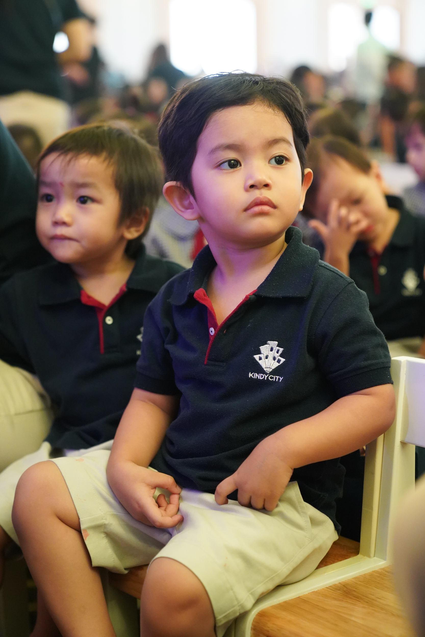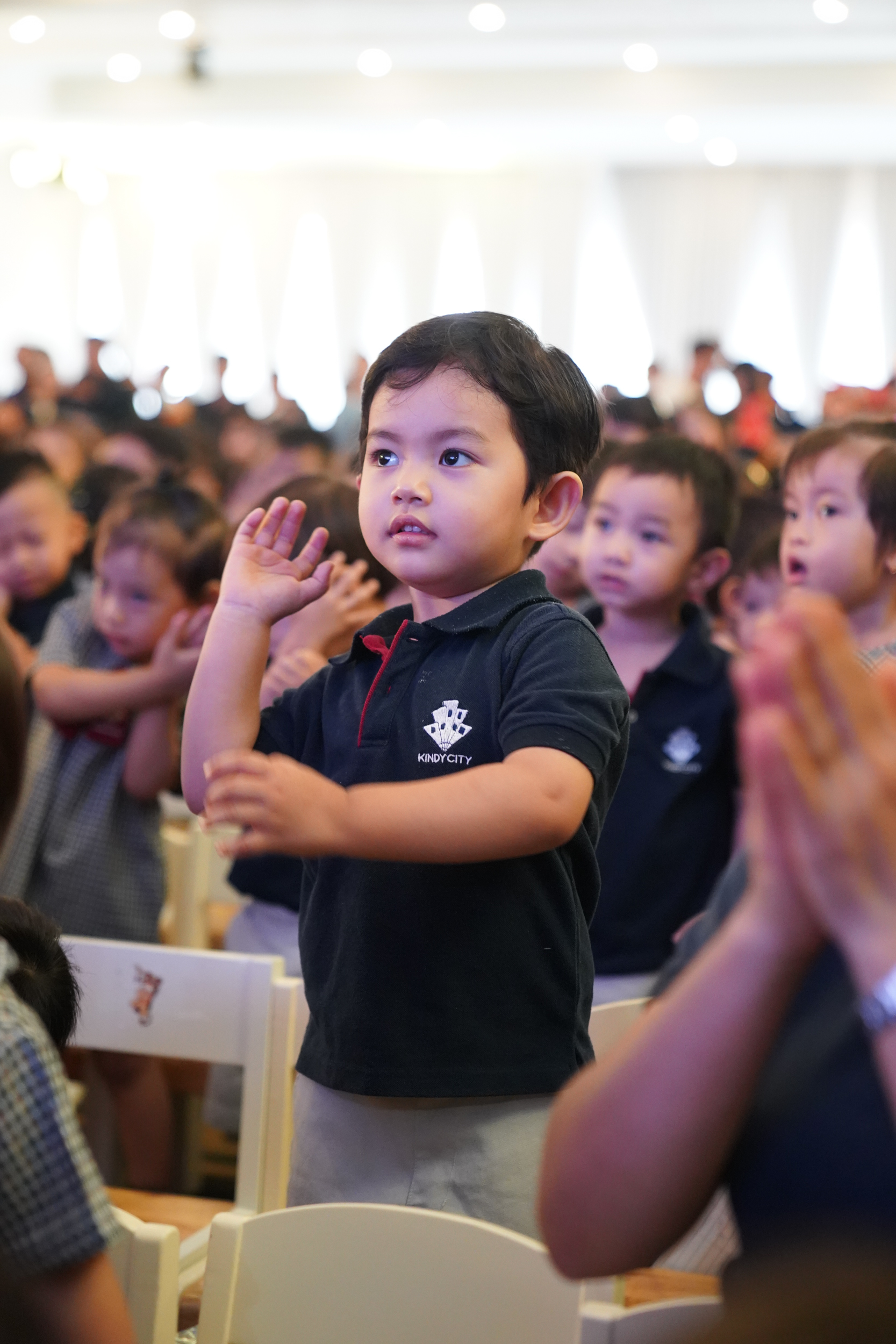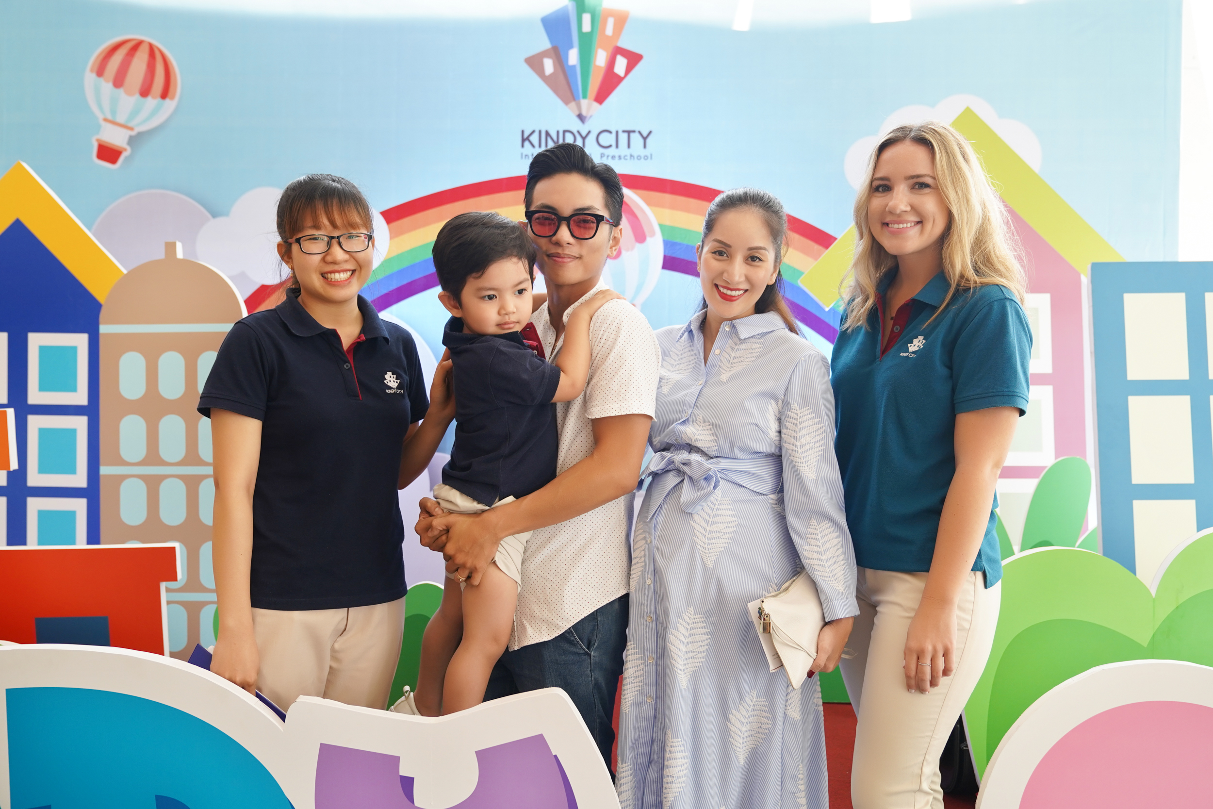 Kubi vui vẻ nắm tay bố mẹ đến dự lễ.