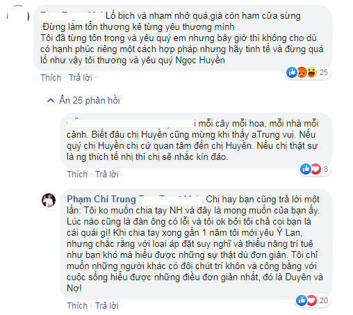 Ngoài ra Chí Trung còn cho hay anh không muốn chia tay Ngọc Huyền và mọi quyết định đều từ phía cô. Cụ thể anh viết: “Tôi không muốn chia tay Ngọc Huyền và đây là mong muốn của bạn ấy. Khi chia tay xong gần 1 năm, tôi mới yêu Ý Lan nhưng chắc rằng với người áp đặt suy nghĩ như bạn thì khó hiểu được những sự thật dù đơn giản”.