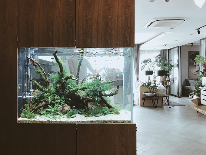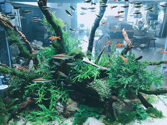Toàn bộ không gian được chia theo phong cách mở hiện đại (modern open space). Cách bài trí cây xanh, bể thủy sinh dạng indoor tropical (nhiệt đới trong nhà), pha trộn các phương thức trồng cây mới của Nhật Bản là Kokedama (trồng cây bằng cục rêu, không dùng đất) và Hydroponical cho xương rồng (dùng nước, không dùng đất).