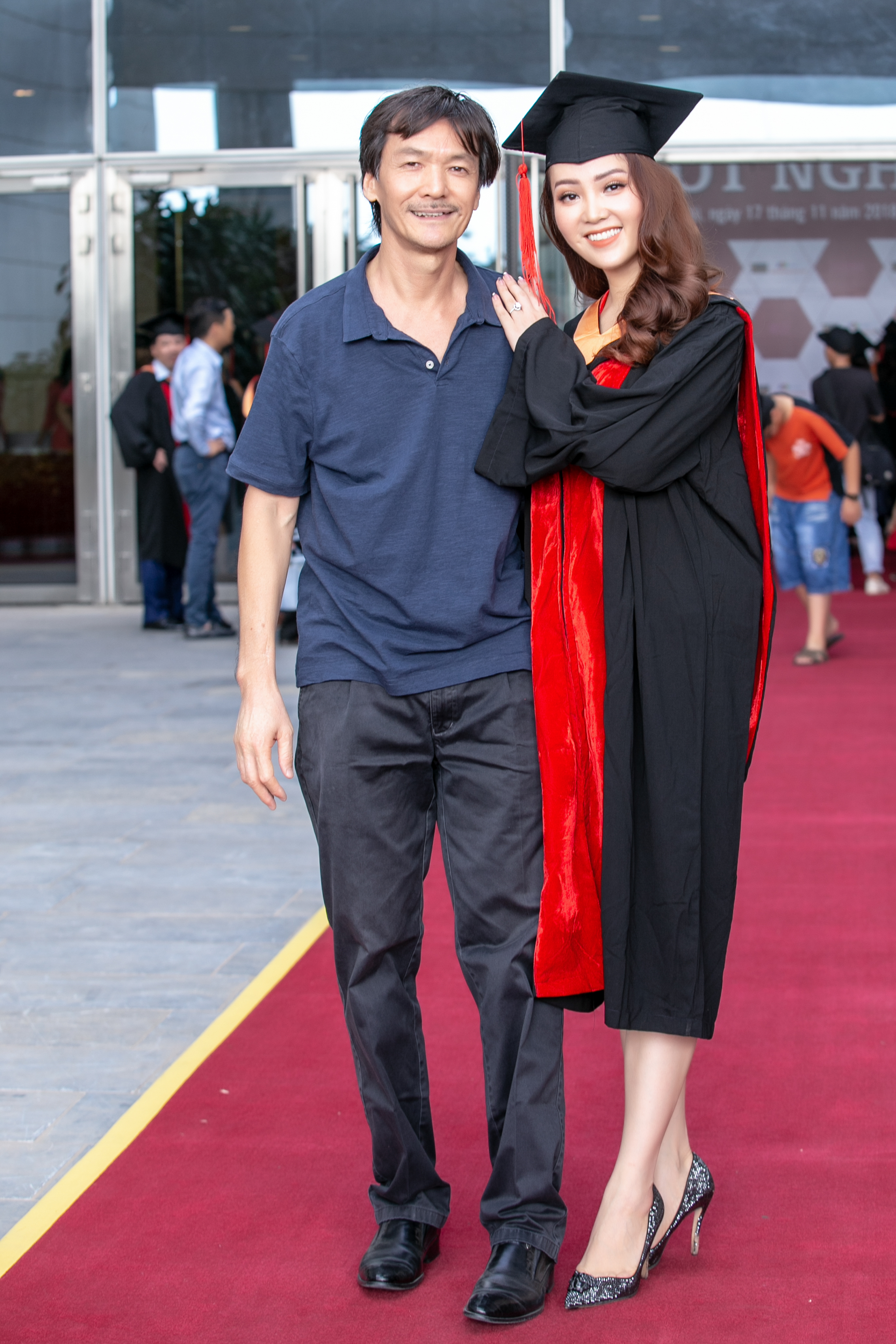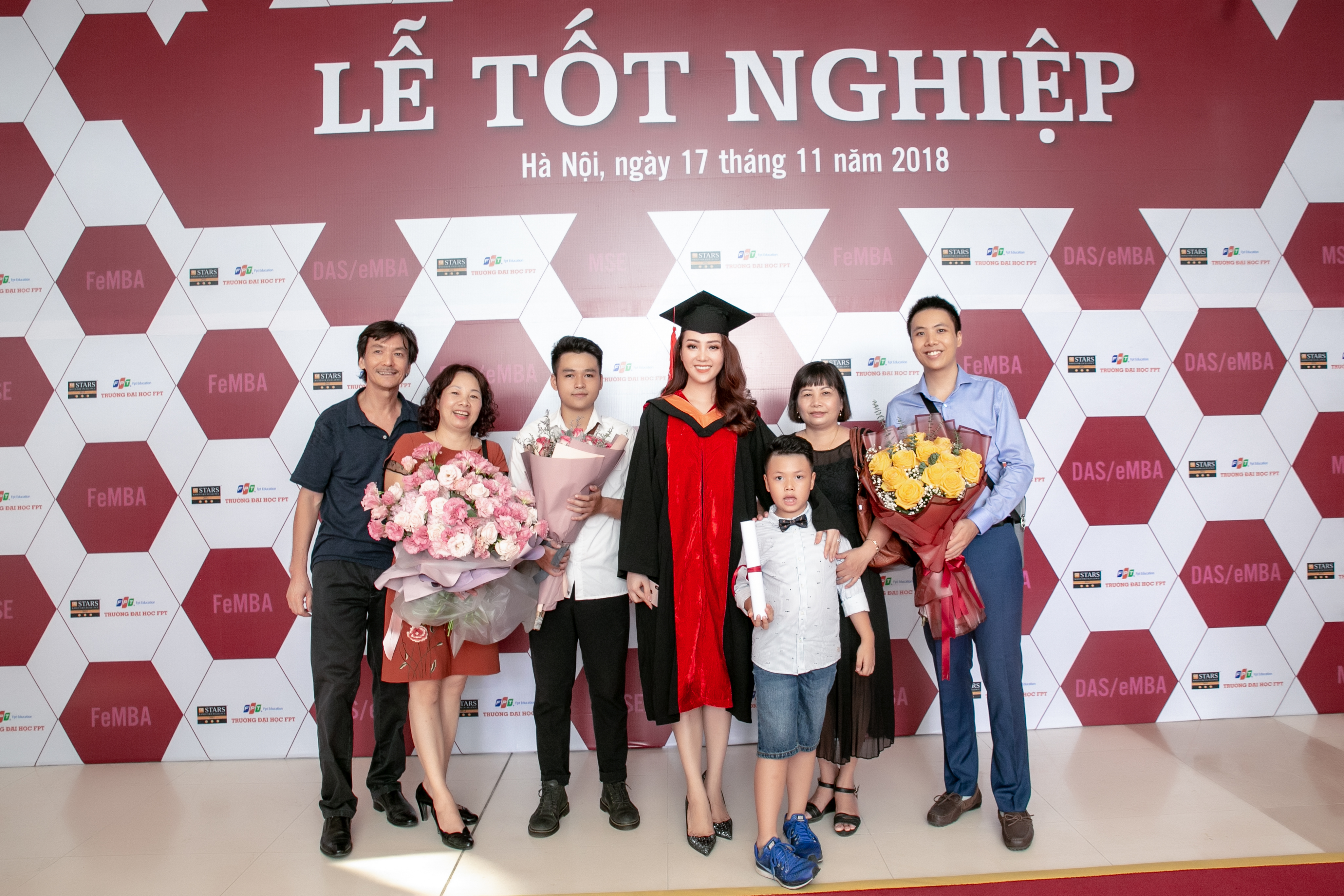 Sau 2 năm học tập, cuối tuần qua Thụy Vân đã nhận bằng tốt nghiệp Thạc sĩ MBA cùng nhiều sinh viên cùng khóa. Cô còn vinh dự là một trong 5 gương mặt xuất sắc của khóa học. Trong ngày nhận bằng, Thụy Vân rất hạnh phúc khi được cả gia đình gồm bố mẹ, em trai, con trai đến chúc mừng.