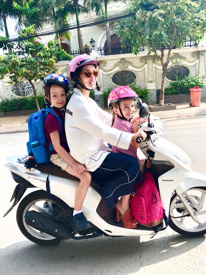 Hình ảnh nữ ca sĩ đón Tôm và Tép đi học về bằng xe máy.