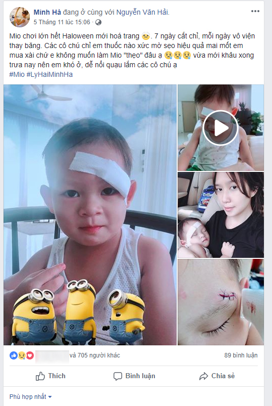 Đây là dòng trạng thái được Minh Hà chia sẻ trên trang cá nhận. Cô viết: “Mio chơi lớn hết Haloween mới hoá trang ?. 7 ngày cắt chỉ, mỗi ngày vô viện thay băng. Các cô chú chỉ em thuốc nào xức mờ sẹo hiệu quả mai mốt em mua xài chứ e không muốn làm Mio “thẹo” đâu ạ ??? vừa mới khâu xong trưa nay nên em khó ở, dễ nổi quạu lắm các cô chú ạ”.