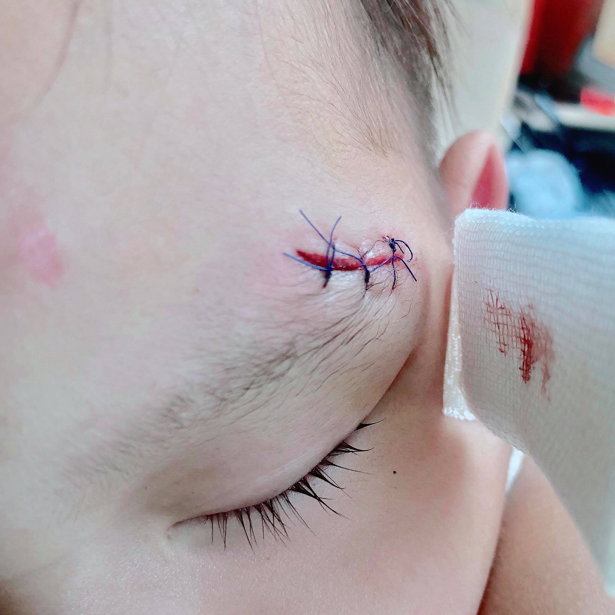 Vết thương khá lớn nên gia đình đưa bé vào bệnh viện quốc tế gần đó để khâu và được bác sĩ yêu cầu mỗi ngày vào viện thay băng, 7 ngày sau mới được cắt chỉ.