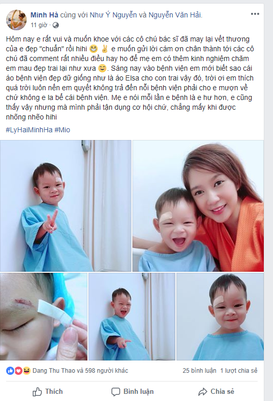Cách đây vài ngày, trên trang cá nhân của Minh Hà mới chia sẻ hình ảnh bé Milo băng bó trên trán với vết thương khâu 3 mũi khiến ai cũng xót ruột, thương cho cậu nhóc. Bé Mio gặp tai nạn vào lúc chiều ngày 5/11 do chạy nhảy đùa nghịch quá mức nên đã bị ngã.