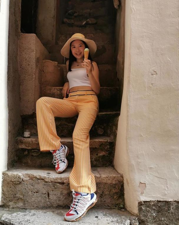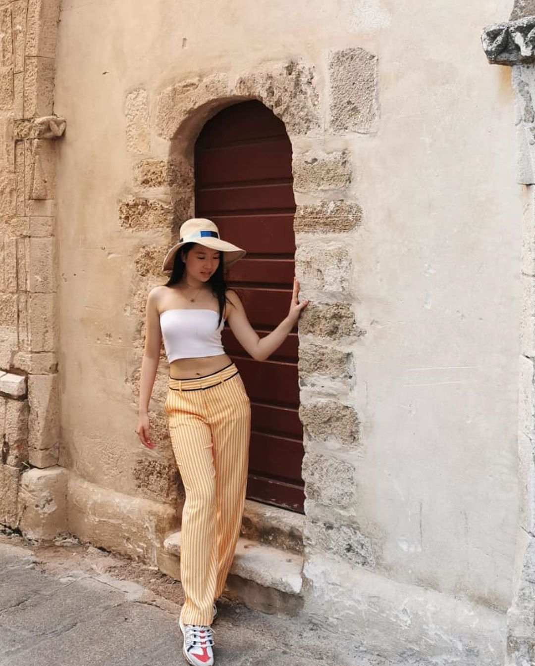 Trong loạt ảnh được Uông Phi Phi đăng tải, Chân Tế Như trông vô cùng trẻ trung năng động với áo quây crop top trắng và quần ống rộng màu vàng kẻ sọc. Bộ trang phục không những khéo léo khoe được eo thon, dáng mảnh của Tế Như mà còn khoe cả đôi chân dài của cô nàng.