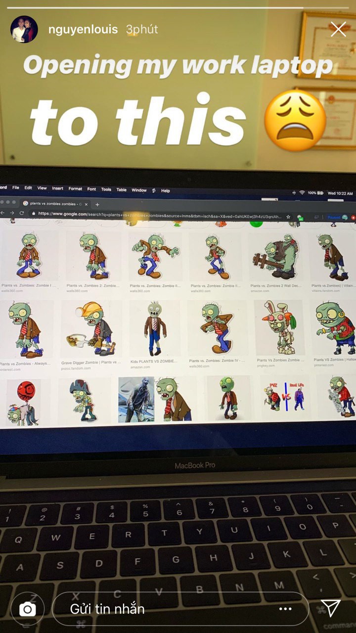 Mới đây, trên trang cá nhân của Louis Nguyễn vừa đăng tải bức ảnh màn hình máy tính ngập tràn hình tìm kiếm zombie, kèm icon khá mệt mỏi và lời chú thích: “Opening my work laptop to this” (Tạm dịch: Mở máy tính của tôi ra làm việc đây này). Mặc dù không nhắc đến tên thủ phạm đã mở máy tính tìm kiếm hình zombie là ai nhưng theo suy đoán của khán giả, có lẽ đó chính là quý tử Richard Nguyễn - con trai đầu lòng của vợ chồng Hà Tăng.