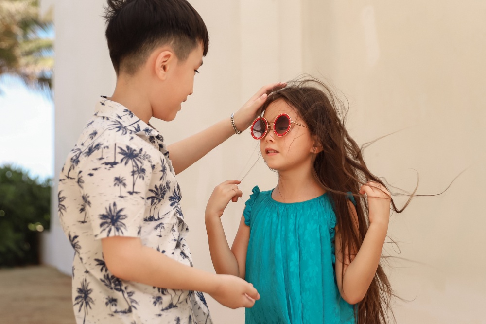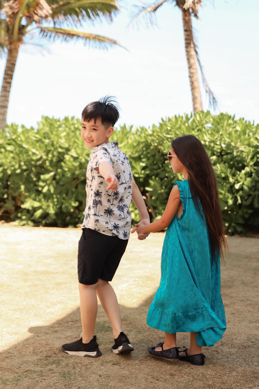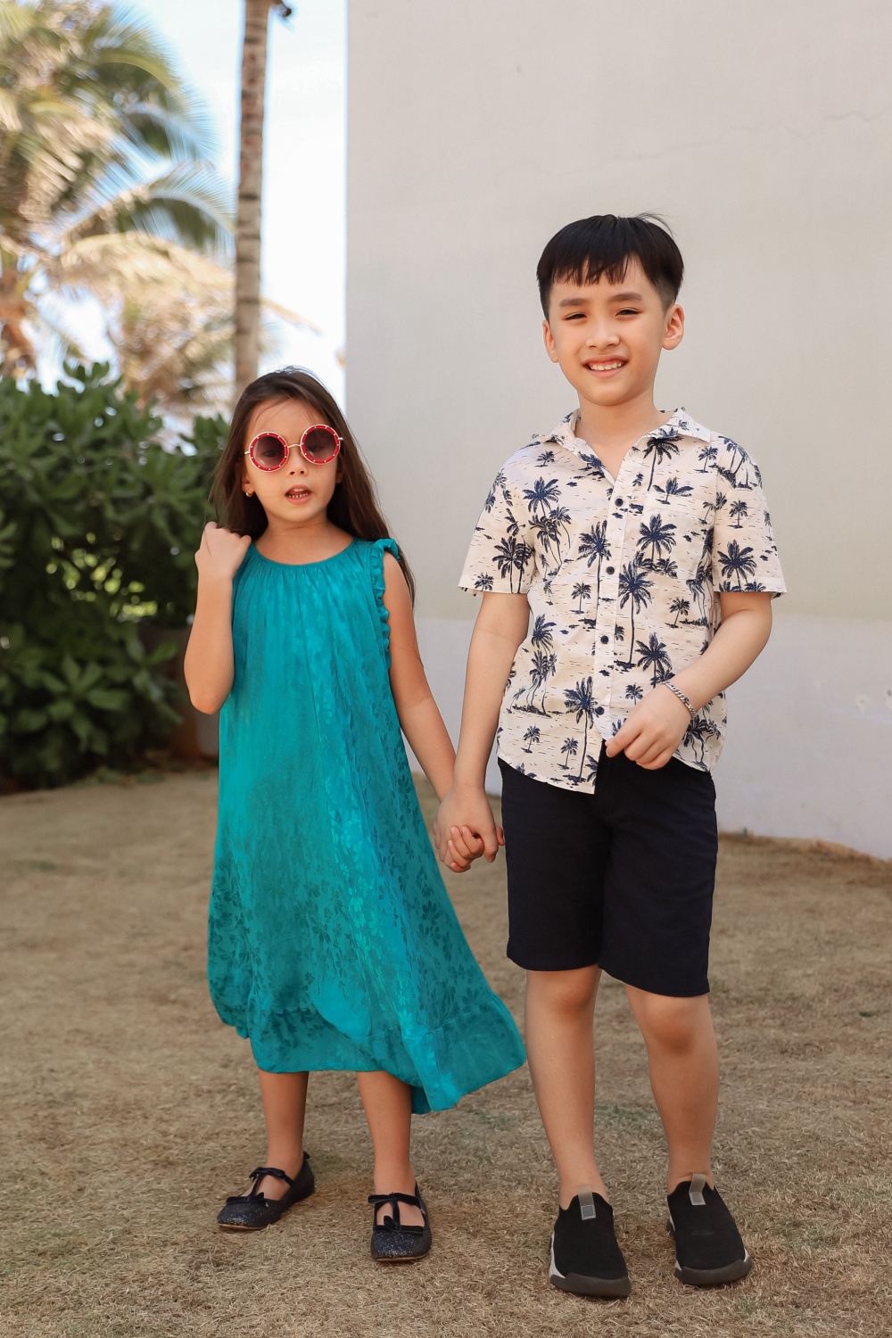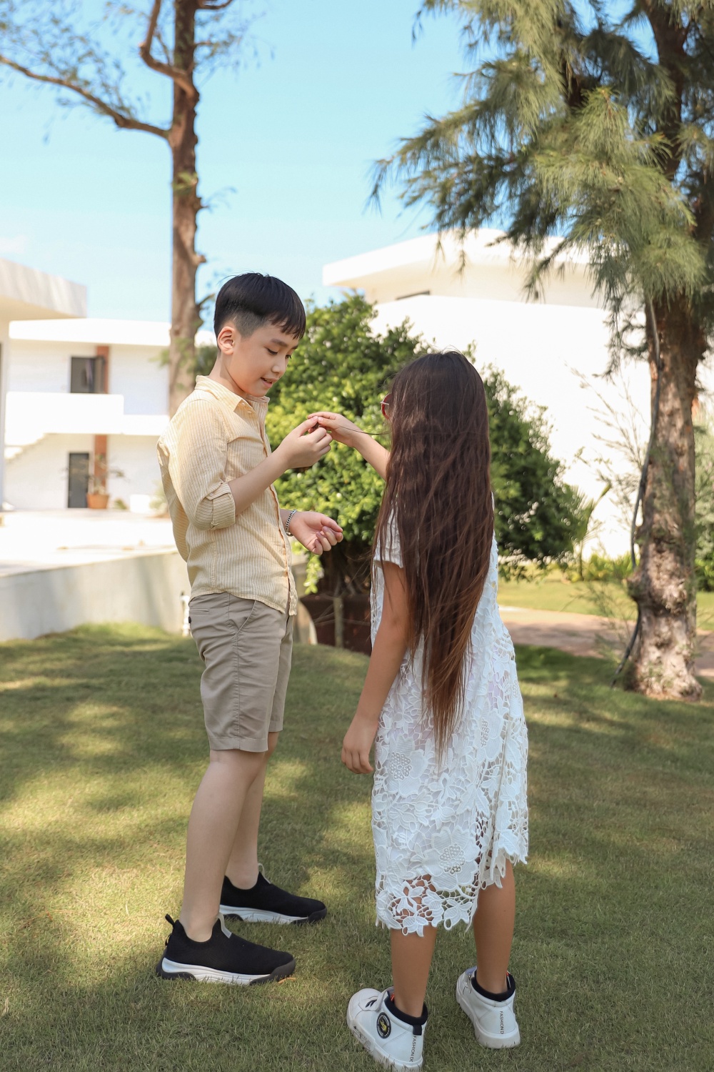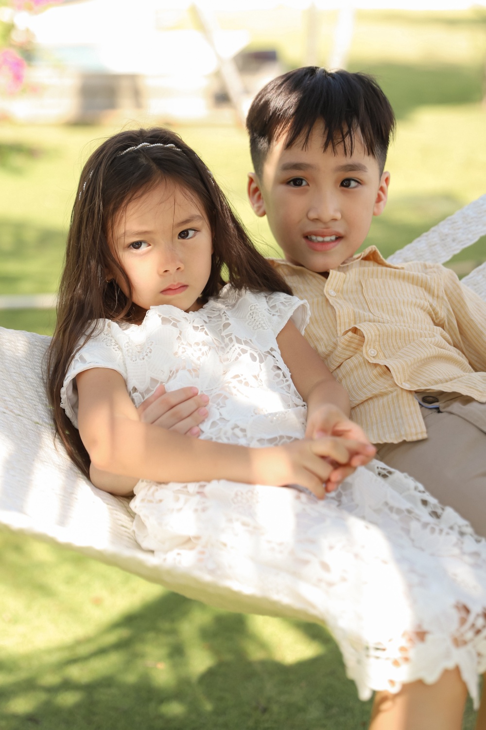 Hay như trong bộ ảnh mới, bé Sol và bé Andy tiếp tục khoác vai vui vẻ. Sự ngây thơ, trong trẻo và hồn nhiên của các bé khiến Thu Trang phải bật cười thích thú. Bộ ảnh này được ghi lại khi các gia đình nổi tiếng cùng đến khu nghỉ dưỡng quay hình cho chương trình Thử thách lớn khôn.