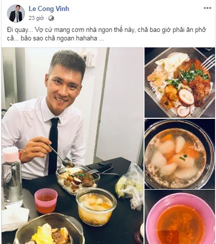 Mới đây một lần nữa Công Vinh lại khiến người hâm mộ phải 'trầm trồ' khi chia sẻ trên trang cá nhân của mình bữa cơm hấp dẫn được chính tay bà xã Thủy Tiên tự tay chuẩn bị khi anh đi làm xa. Cựu tiền đạo chia sẻ: