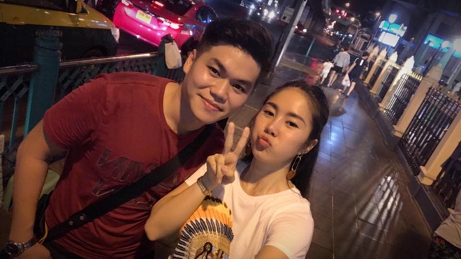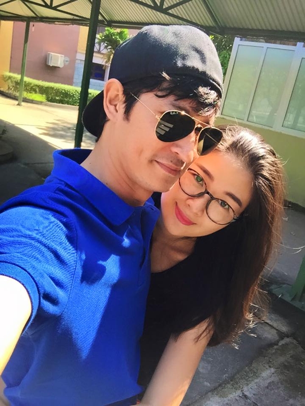 Nữ diễn viên tạo dáng nhí nhảnh bên chồng trong chuyến du lịch mới đây.