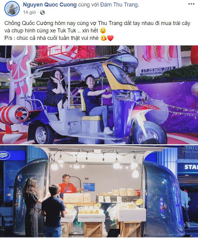Doanh nhân phố núi còn khiến mọi người thích thú khi viết cả dòng trạng thái bắt trend: “Chồng Quốc Cường hôm nay cùng vợ Thu Trang dắt tay nhau đi mua trái cây và chụp hình cùng xe Tuk Tuk… xin hết. P/s: chúc cả nhà cuối tuần thật vui nhé”.
