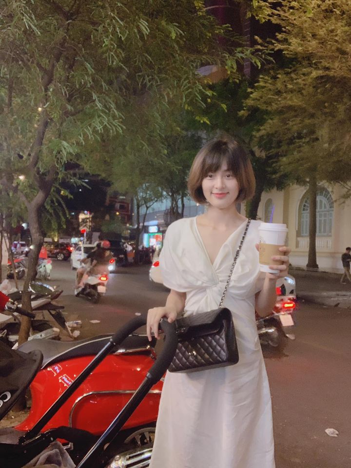 Người đẹp trông có da có thịt hơn so với trước đây. Hạ Vi cắt tóc ngắn diện 1 chiếc đầm trắng xinh xắn. Cô đeo chiếc túi che trước bụng nhưng nhiều người vẫn có thể ngờ ngợ rằng vòng 2 của người đẹp nhô cao. Không những thế, bên tay phải của Hạ Vi còn cầm 1 chiếc tay đẩy của xe nôi em bé.