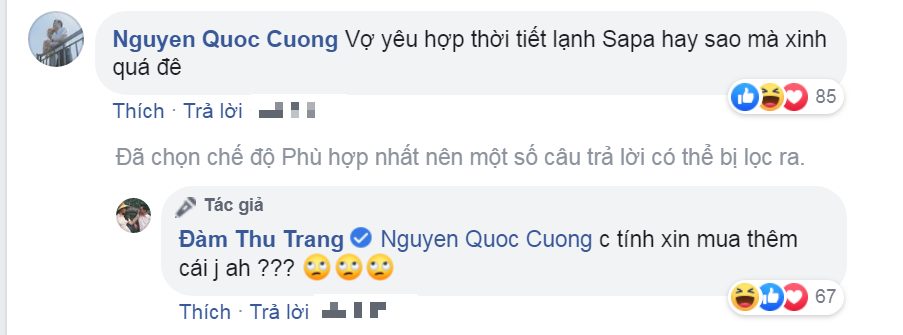 Mới đây cặp đôi còn khiến nhiều người thích thú khi công khai 'thả thính' nhau. Cụ thể khi Đàm Thu Trang đăng một tẩm ảnh selfie ấm áp tại Sapa thì Cường Đôla đã lập tức để lại bình luận nịnh ngọt bà xã của mình. Anh viết: “Vợ yêu hợp thời tiết lạnh Sapa hay sao mà xinh quá đê”.