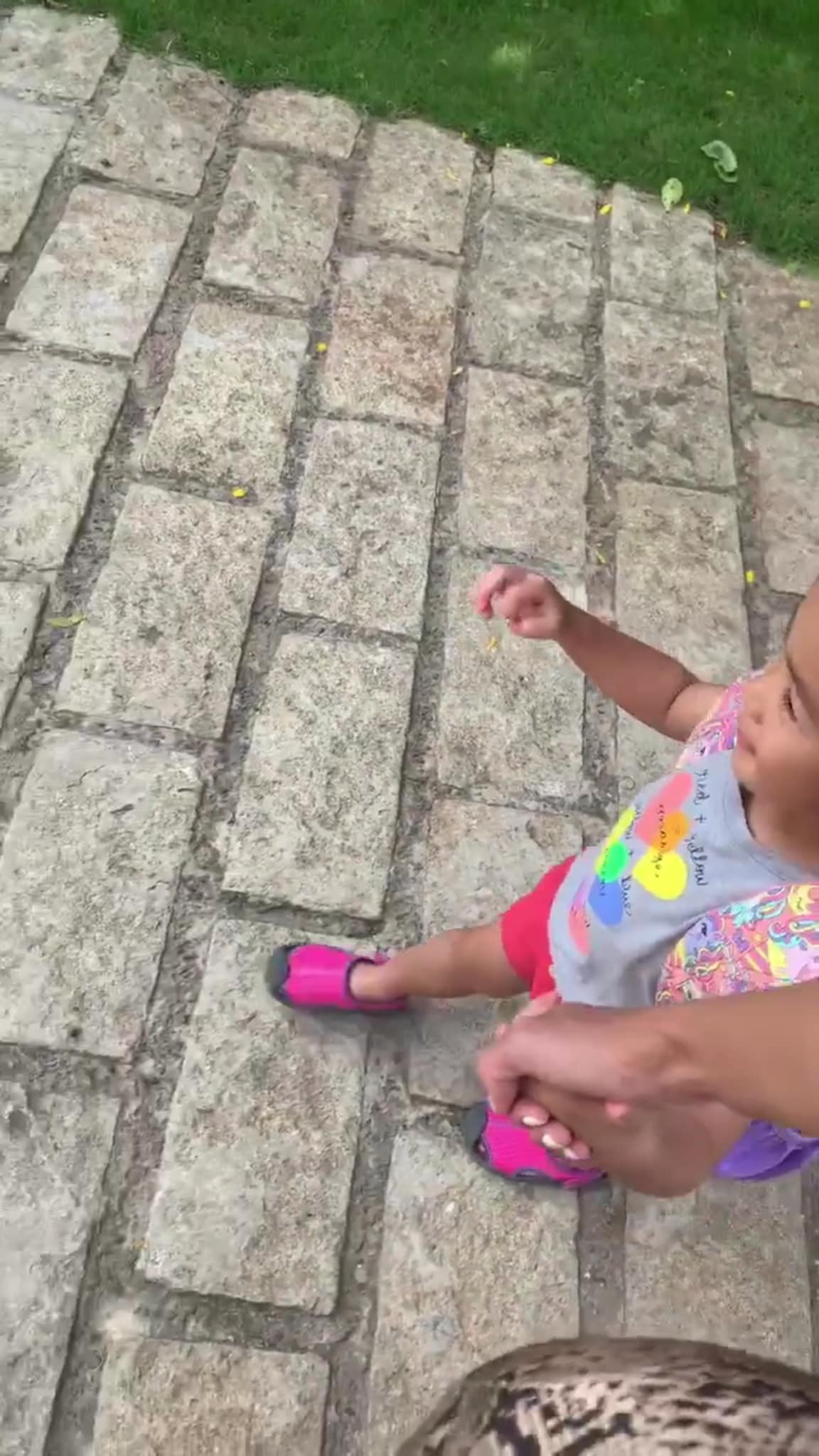 Xuất hiện trong clip của mẹ, bé Chloe diện nguyên một cây hồng với quần hồng, dép hồng và balo cũng có chút hồng. Cô bé đội một chiếc mũ rộng vành hoàn toàn che kín gương mặt