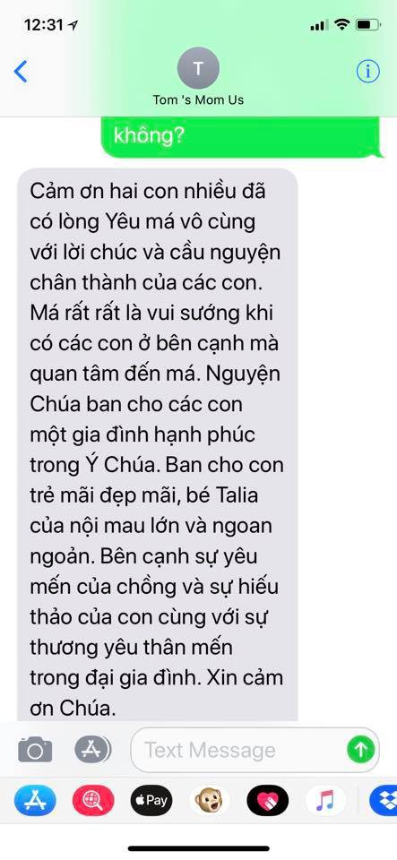 Mẹ chồng cô thậm chí còn gửi tin nhắn cảm ơn con dâu hiếu thảo và chúc Thanh Thảo luôn trẻ đẹp, cháu nội của bà mau lớn và ngoan ngoãn khiến cô vô cùng vui mừng.