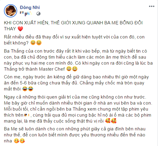Mới đây, trên trang cá nhân, Đông Nhi đã có những chia sẻ về sự thay đổi trong cuộc sống của hai vợ chồng từ khi mang thai. Nữ ca sĩ xúc động viết: “Khi con xuất hiện, thế giới xung quanh ba mẹ bỗng đổi thay. Rất nhiều điều đã thay đổi vì sự xuất hiện tuyệt vời của con đó, con biết không?”