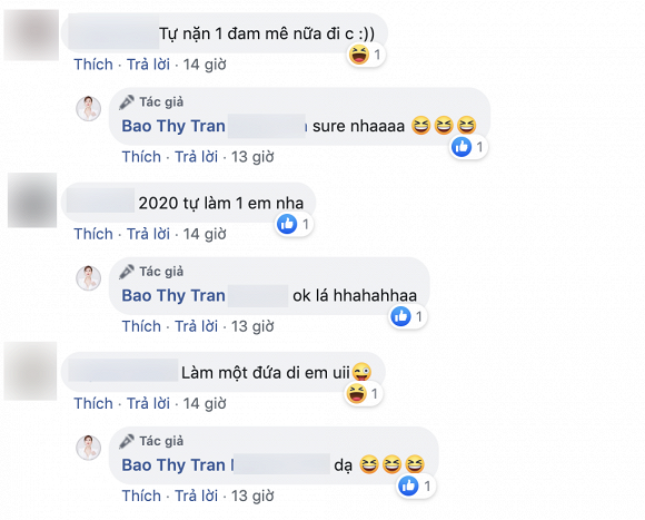 Thay vì “trốn tránh”, nữ ca sĩ lại thoải mái trả lời cư dân mạng cũng như bạn bè. Có vẻ “số phận đã được định đoạt” khi cô trả lời “Sure nha” để đồng ý với đề nghị này. Có vẻ Bảo Thy đang sẵn sàng chào đón nhóc tì đầu lòng của mình.