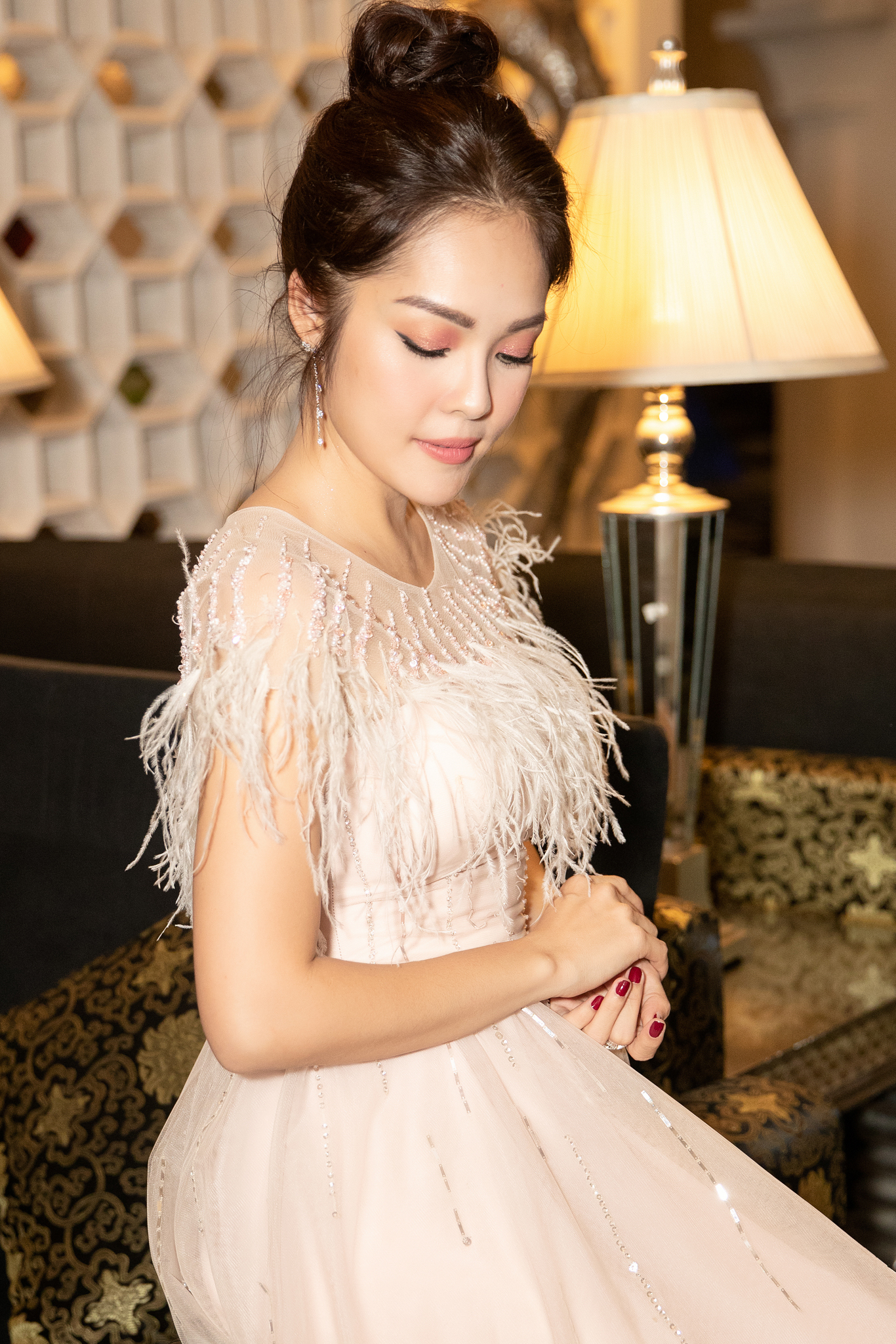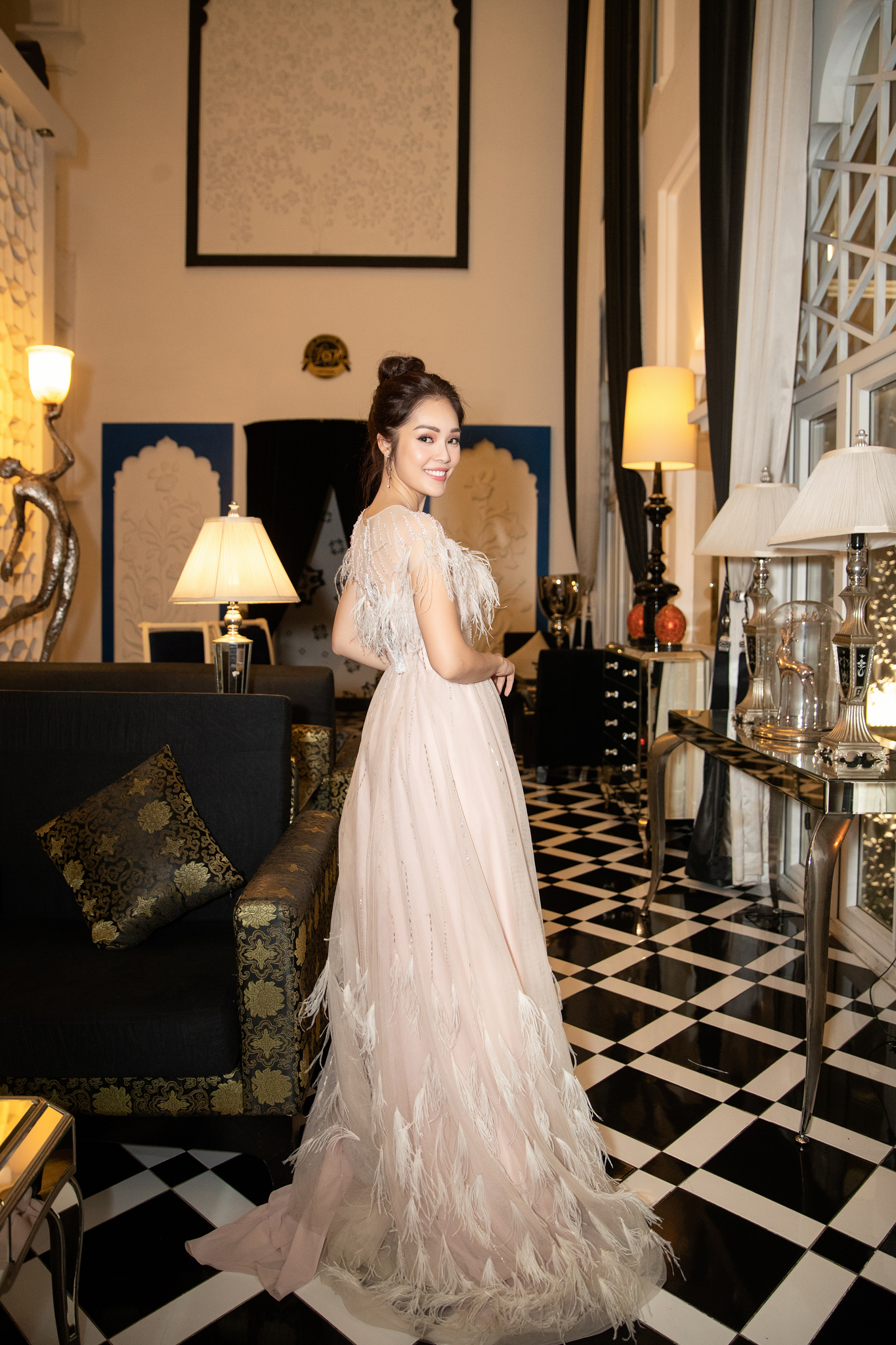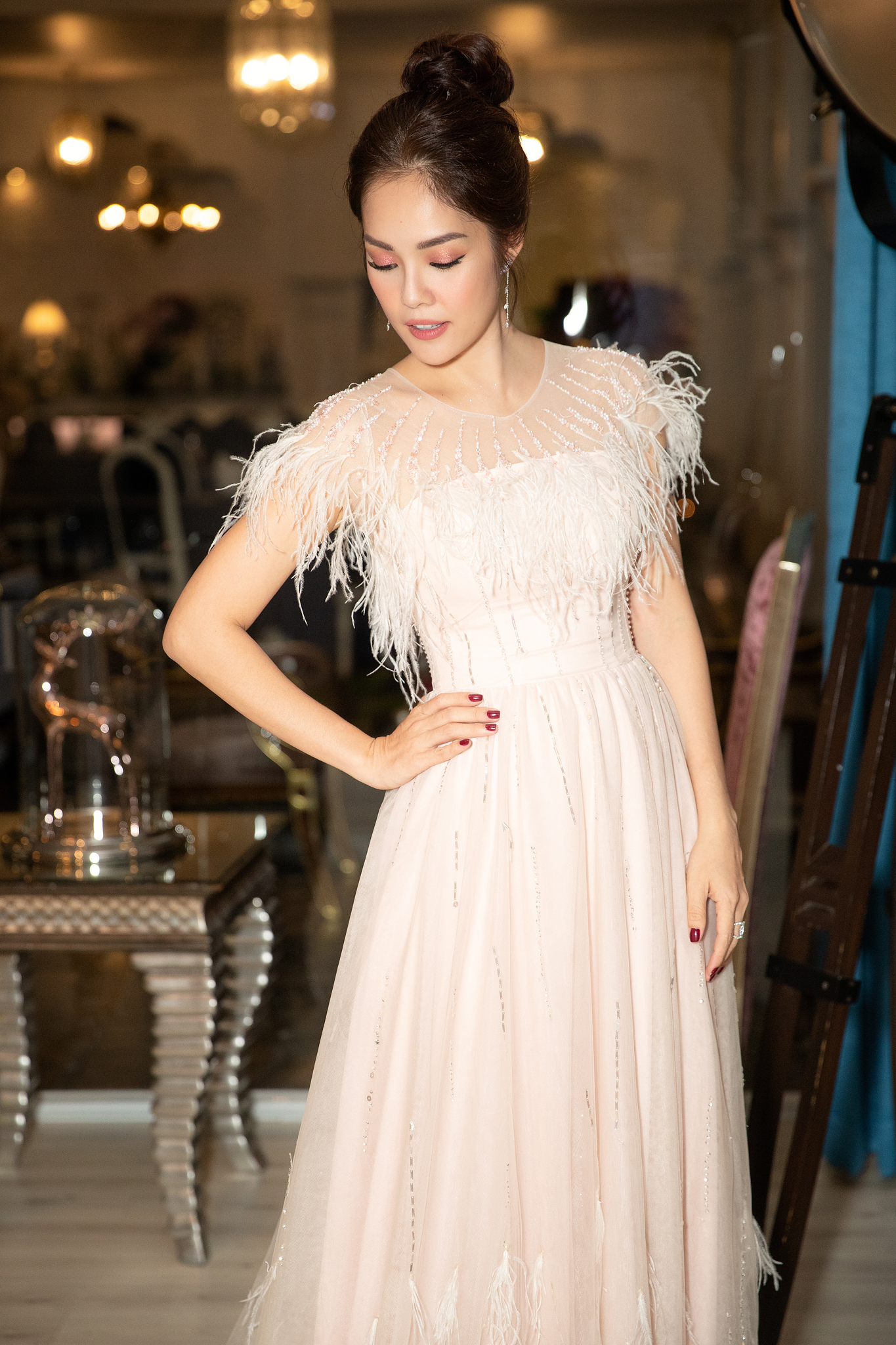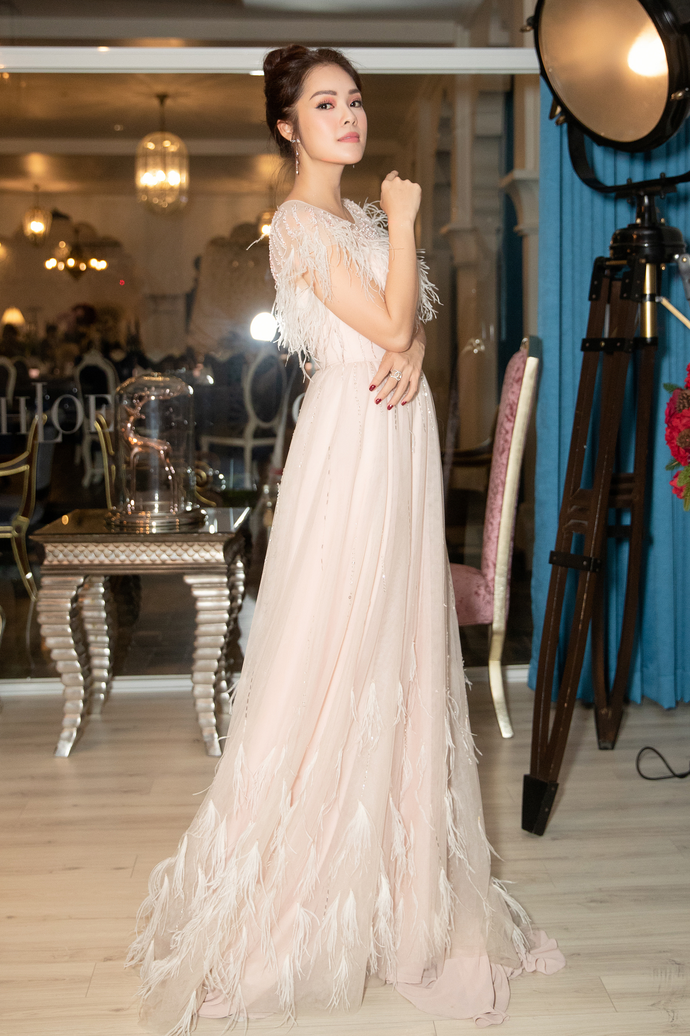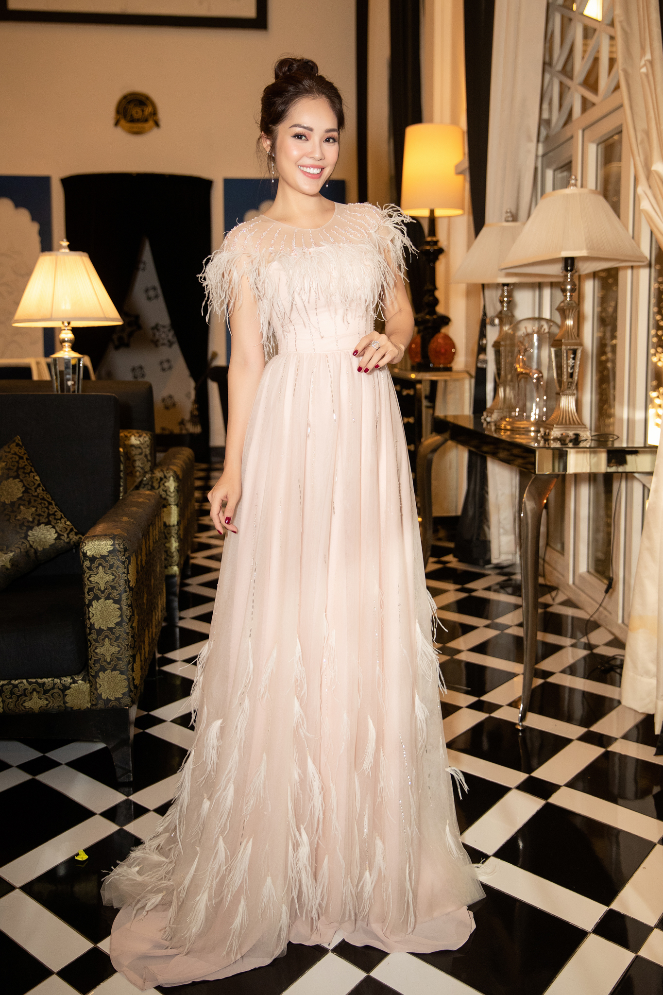 Người đẹp vô cùng nổi bật khi chọn cho mình một chiếc váy xòe bồng bềnh. Gam màu nuy trên chất liệu chọn lọc với lụa, vải ren có độ mềm dễ chịu. Ngoài ra, cách xử lí đính kết lông vũ của bộ trang phục đã mang đến vẻ lãng mạn và đậm chất nữ tính cho cô.